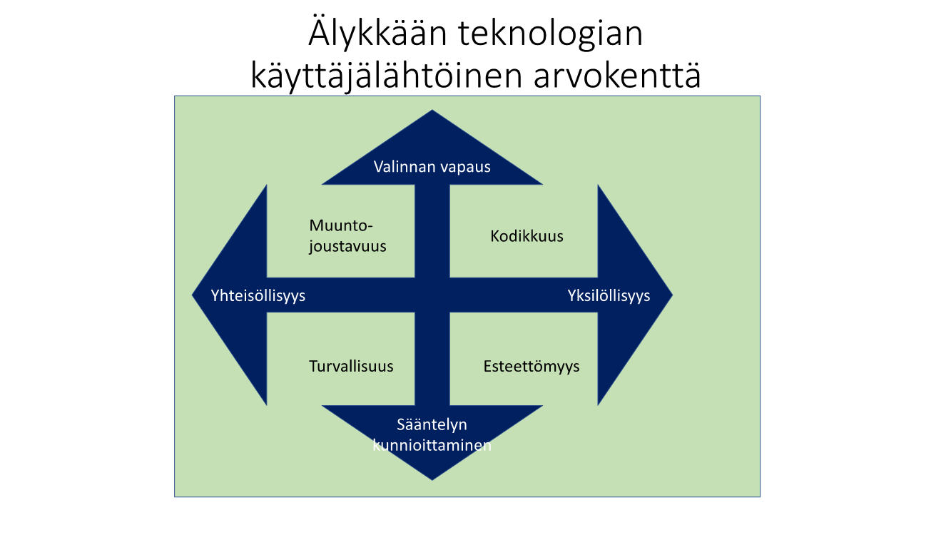 Tulevaisuuden haasteena on ikääntyneen henkilön arvoja vastaavan palveluasumisen kehittäminen. Yksi keino toiminnallisen ja mielekkään arjen mahdollistamiseksi on arvioida älykkään teknologian tuotteita ja palveluja suhteessa käyttäjälähtöisyyttä ohjaaviin arvoihin.