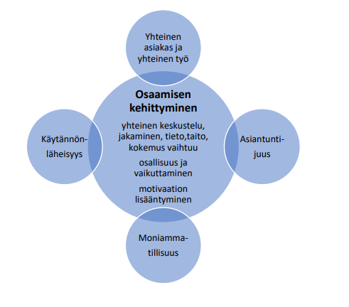 Moniammatillinen ja kotihoidon olemassa olevaa asiantuntemusta sekä työkemusta hyödyntävä kehittämistyöskentely on ketterää eikä vaadi suurta panostusta. Kotihoidossa kehittämistyötä ja yhteisiä asiakassuunnitelmia voitaisiin tehdä nykyistä enemmän kehittämistyössä käytettyä moniammatillista työpajamallia soveltaen. Samalla toiminta lisää osallistujien ymmärrystä eri ammattiryhmien asiantuntijuuksista muistisairaan asiakkaan hoidossa ja kuntoutuksessa lisäten näin tulevaisuuden yhteistyömahdollisuuksia.