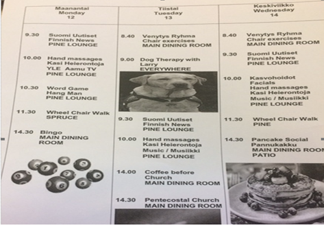 Keskusteluissa Finncaren henkilökunnan kanssa tuli esille, että muistisairaiden yksikössä on monta asukasta, jotka pystyvät ilmaisemaan itseään paremmin suomen kielellä, mutta valitettavasti työvuorossa olevat hoitajat ja hoitoapulaiset osaavat usein vain englantia. Tarve keskustella suomen kielellä on suuri, koska asukkaat käyttävät suomea mieluummin kuin englantia. He joko eivät osaa englantia riittävästi tai olivat unohtaneet sen. Siksi suomen kieltä puhuvia vapaaehtoistyöntekijöitä tarvitaan. Yhdessä olemisen ja keskusteluihin liittyvät kokemukset voisivat olla molemmin puolin erittäin antoisia ja opettavaisia. (Richardson & Worboyes 2018.)