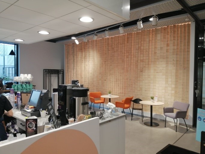 D-sisäänkäynnin luona on kahvila, josta saa kevyttä lounasta, välipaloja ja leivonnaisia. Siellä liikkuminen esimerkiksi apuvälineiden kanssa on selvästi helpompaa kuin lounasravintolan puolella – kahvila on sisustettu väljästi. Lisäksi kahvilan vieressä on lehtiä luettavaksi, joten kampukselle voi tulla viihtymään pidemmäksikin aikaa.