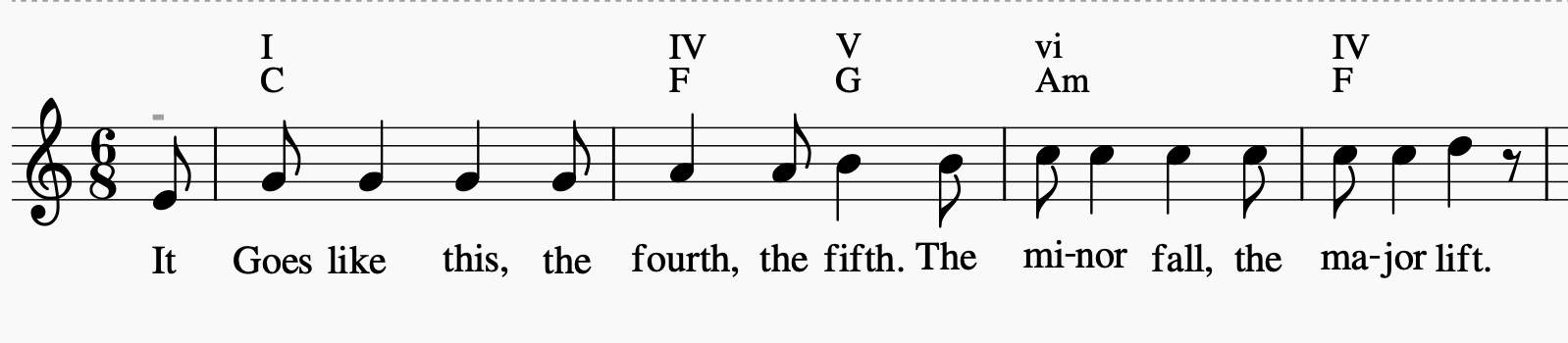 Opinnäytetyön yksi selkeimpiä esimerkkejä harmonisesta word paintingistä on Leonard Cohenin säveltämä ja sanoittama Hallelujah-kappale [10], jonka ensimmäisessä säkeistössä lauletaan ”It goes like this, the fourth, the fifth. The minor fall, the major lift.” Musiikin liikkeet noudattavat teoreettisesti täysin tekstiä (kuva 3): Harmonia kulkee neljänneltä asteelta viidennelle, sitten kuudennen asteen mollille ja takaisin neljännen asteen duurille, melodian tasaisesti kohotessa.