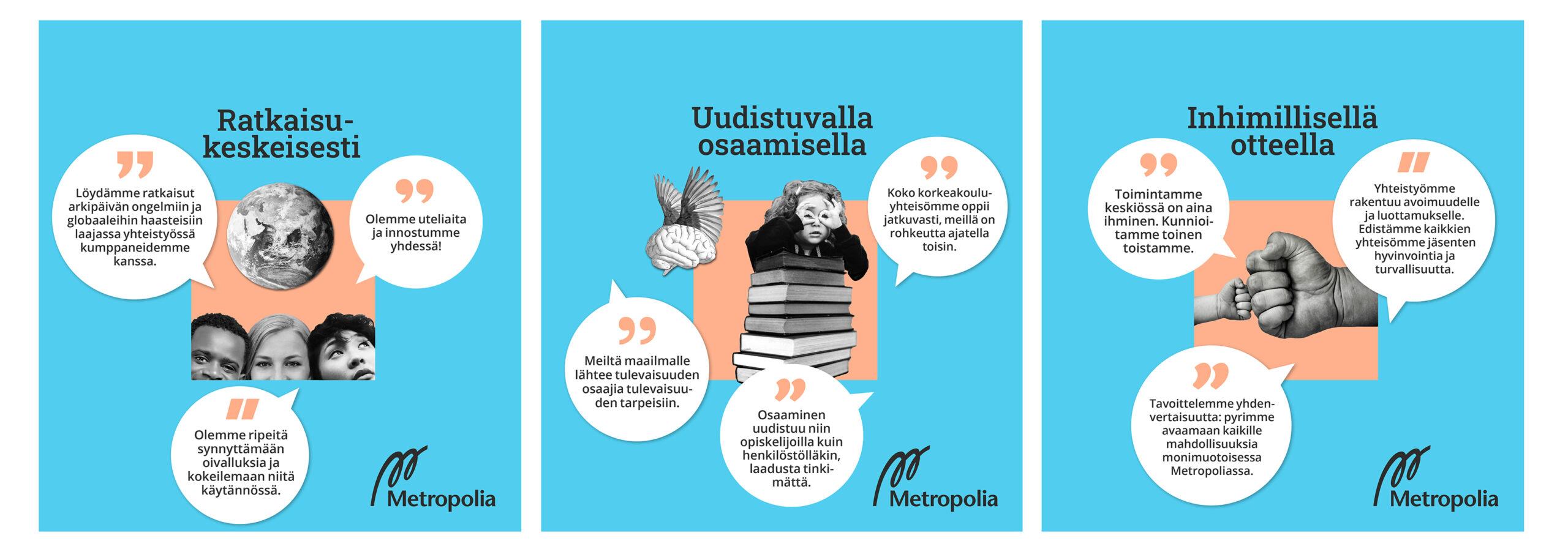 Kutsuimme kaikkia korkeakouluyhteisön jäseniä kertomaan, mistä asioista he ovat Metropoliassa ylpeitä ja sen jälkeen arvioimaan omia ja toisten ehdotuksia. Tähän vaiheeseen oli mahdollista osallistua yksin tai yhdessä toisen kanssa.