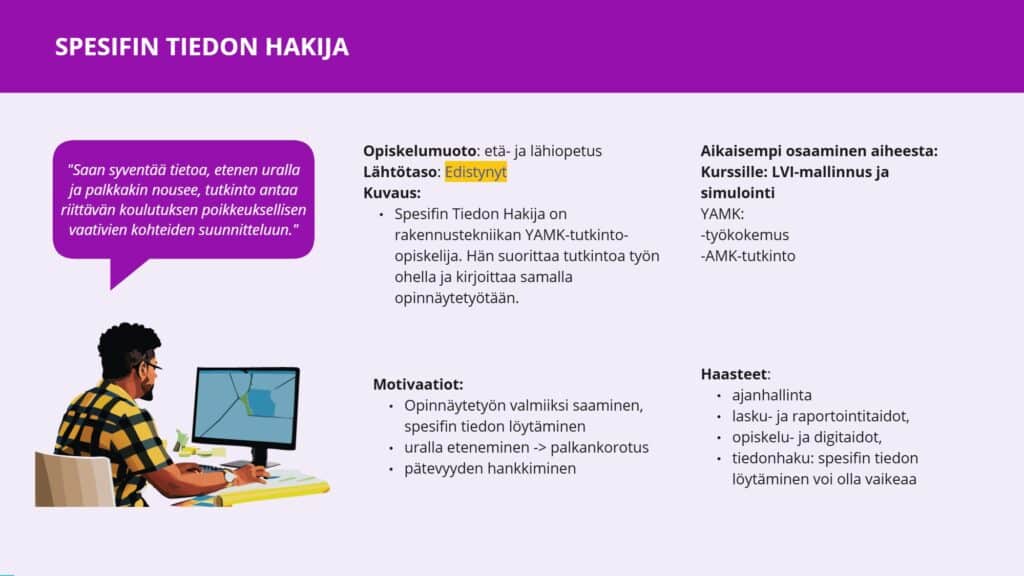 Spesifin Tiedon Hakija on edistynyt rakennustekniikan YAMK-tutkinto-opiskelija. Hän suorittaa tutkintoa työn ohella ja kirjoittaa samalla opinnäytetyötään. Häntä motivoi erityisesti opinnäytetyön valmiiksi saaminen, pätevyyden hankkiminen sekä mahdollisuudet uralla etenemiseen ja palkankorotukseen. Hänen haasteensa liittyvät tarkan tiedon löytämiseen, ajanhallintaan sekä työn ja opiskelun yhdistämiseen. Hän saattaa myös kohdata vaikeuksia laskelmien ja raportoinnin kanssa. Opettaja-työpari, joka työsti kyseessä olevia persoonia, lisäsi kuvaukseen oppijan kokemuksia kuvaavan lainauksen: ”Saan syventää tietoa, etenen uralla ja palkkakin nousee, tutkinto antaa riittävän koulutuksen poikkeuksellisen vaativien kohteiden suunnitteluun.”