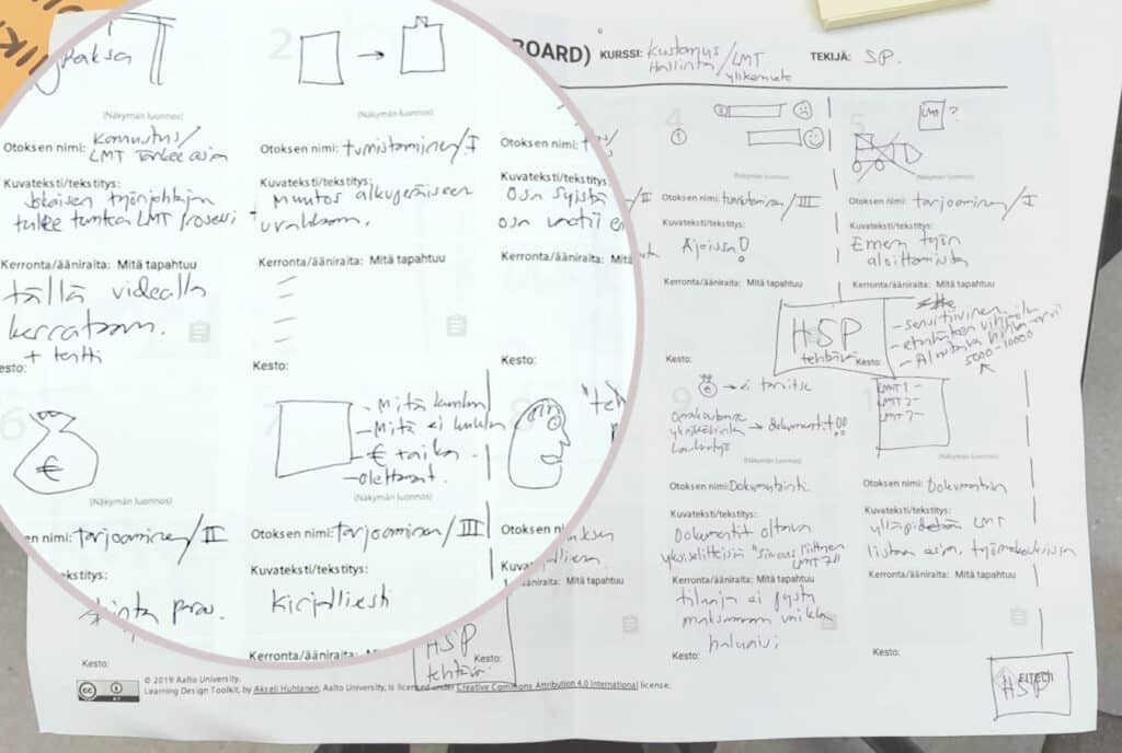 Alla (kuva 3) on esimerkki videon kuvakäsikirjoituksesta, jonka opettaja laati Aikataulu- ja työnsuunnittelu -opintojaksoa varten. Siihen on hahmoteltu pääpiirteittäin, mitä eri otoksissa näkyy, millaista tekstiä kuvissa on ja mitä ääniraidalla kuuluu kunkin otoksen aikana. Vaikka FITechin työpohja sisältää tasan kymmenen otosta, opettaja voi itse päättää, minkä pituisen videon hän haluaa tehdä. Yleensä mitä lyhyempää videota haluaa suunnitella, sitä tarkempaa suunnittelua se edellyttää.