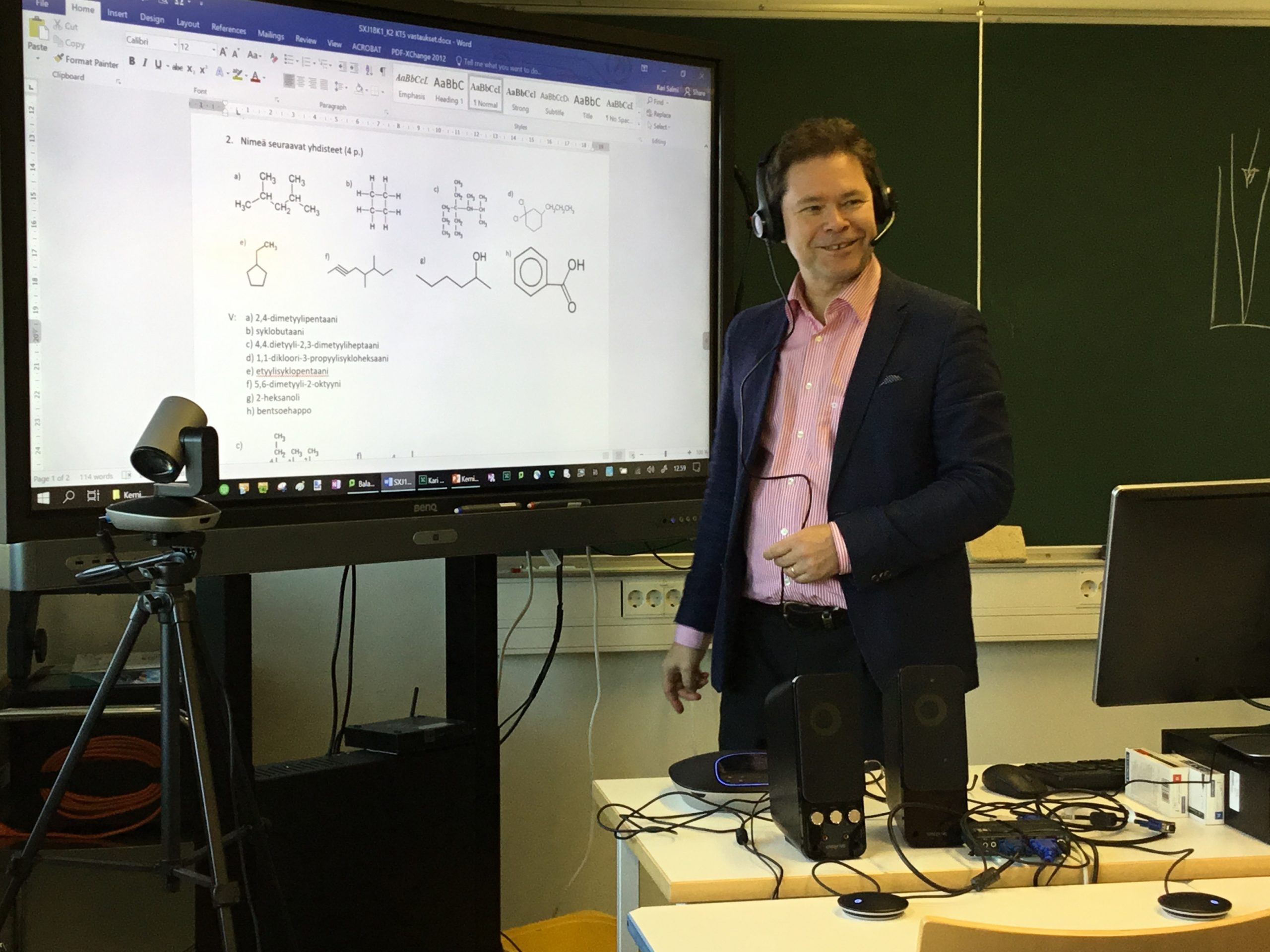Samaa vanhaa verkossa vai uudistumista, valinnan mahdollisuuksia ja innostumista? Opetus ammattikorkeakouluissa perustuu usein edelleen perinteisiin opetusmenetelmiin ja lähiopetukseen paikan päällä. Opetusta “annetaan” auditorioissa, luokkahuoneissa ja laboratorioissa. Opetushenkilökunnan parissa on pidetty yllä ajatusta, että useiden alojen opetus ei merkittävästi hyödy uudesta teknologiasta, eikä opetuksen siirtäminen verkkoon ole mahdollista. Yksi näiden vahvojen perinteiden parissa painivista tieteenaloista ovat matemaattis-luonnontieteelliset (LuMa) perustieteet. Niiden opettaminen ja opiskelu ovat aina hyötyneet kaavojen piirtämisistä taululle, niiden selittämisestä ja niistä käytävistä keskusteluista. Lähiopetus paikan päällä ja siihen liittyvä konkretisoiminen on ollut opettamisen vahvaa ydintä, jonka opettajat ovat kokeneet lähes välttämättömänä. Opetustilanteiden muuttaminen vaatii sitkeää työtä ja äärettömän motivoitunutta henkilökuntaa, halua tehdä asiat uudella tavalla. Muuttuva yhteiskunnallinen tilanne edellyttää muutoksia myös korkeakoulutukselta. On uudistettava ja uudistuttava, sovellettava nykyteknologiaa joustavan oppimisen mahdollistamiseksi. Opetuksen uudenlaisten järjestelyjen tulee tukea sekä lähialueella että kauempana asuvia opiskelijoita. Enää ei ole poikkeus, että opintoja suoritetaan kokonaan toiselta paikkakunnalta esimerkiksi niin, että opettaja pitää lähiopetustunnit Helsingissä ja etäyhteydellä opetukseen osallistuu samaan aikaan opiskelijoita Kajaanissa, Kokkolassa, Rovaniemellä tai Lappeenrannassa. Tämäntyyppisen satelliittikoulutuksen järjestämisestä on Metropolia Ammattikorkeakoulussa jo vuosien kokemus mm. bioanalytiikan, radiografian ja suun terveydenhuollon opetuksessa. Näissä yhteyksissä moni opettaja on joutunut uudistamaan opetusmenetelmiään, mallejaan ja tapojaan. On joutunut opettelemaan ja oppimaan uutta. Kokemuksesta huolimatta korkeakouluilla on edelleen paljon opittavaa. Tämä seuraava käytännön esimerkki kertoo etäopettamiseen liittyvistä, huomioonotettavista asioista. Tapauksena on 53 opiskelijan kemian opetusryhmä (bioanalyytikko-opiskelijat), josta puolet ryhmästä opiskeli paikan päällä Helsingissä ja toinen puoli etänä eri puolilla Suomea. Opetuksesta vastaisi kemian yliopettaja (TkT) Kari Salmi, jolla on vuosien kokemus kemian opettamisesta ammattikorkeakoulussa. Metropolian entinen digipäällikkö, yliopettaja Mari Virtanen (TtT) toimi kokeilussa kollegiaalisena vertaistukena, digitaalisen pedagogiikan näkökulmasta. Kari otti uudenlaisen haasteen vastaan, vaikka opetuksen toteuttaminen uudella tavalla jännittikin etukäteen. Hänellä ei ollut aiempaa kokemusta etäopetuksen välineiden kuten verkkokokouksiin tarkoitetun Adobe Connectin tai interaktiivisen älytaulun käytöstä. Kari kehitti opetukseen soveltuvan menetelmän nopeasti ja alkoi innolla pystyttää omaa ”etäopetusimperiumiaan”. (Kuva 1.) Tarkoituksena oli saattaa etäopetus mahdollisimman lähelle perinteistä lähiopetusta ja säilyttää hyvät käytänteet vuosien varrelta. Kuva 1. Karin “etäopetusimperiumi”. Alkuvalmisteluissa riitti puuhaa Etäopetustilana käytettävään luokkahuoneeseen hankittiin tarvittavaa välineistöä. Kokonaisuuteen kuului älytaulu, luokkahuonetta kuvaava kamera, konferenssimikrofoni, kaiuttimet ja tietokone, jonka kautta etäopetusohjelmaa (Adobe Funet) hallittiin. Alkuvaiheessa eniten energiaa meni laitteiston osien testaukseen. Ja seuraavien asioiden pohtimiseen: Minkälaisia kaapeleita, liittimiä ja sovittimia tarvitaan? Montako tietokonetta tarvitaan? Miten piirtää kaavoja ja molekyylejä näppärästi? Miten interaktiivista älytaulua käytetään? Miten välittää ääntä ja kuvaa molempiin suuntiin? Miten ja minkälaista materiaalia halutaan jakaa ja miten hyödynnetään eri tietokoneiden näkymiä? Miten kamerat kuvaavat luokkatilaa ja millä alueella opettaja voi liikkua? Miten huomioida samanaikaisesti opiskelijat sekä paikan päällä että etänä? Yhdeksi pääroolin esittäjäksi tässä kokeilussa valittiin interaktiivinen älytaulu, joka mahdollisti piirtämisen vapaalla kädellä. Etäopetusjärjestelmän videokuva ja kaiutin-mikrofoniyhdistelmä mahdollistivat puolestaan opettajan vapaan liikkumisen luokkahuoneessa sekä reaaliaikaisen keskustelun välittämisen. Toteutuksen kulku käytännössä Opetuksen sisällöt ja osaamistavoitteet perustuivat bioanalytiikan tutkinnon opetussuunnitelmaan, käytännön toteutuksen suunnitteli Kari. Kontaktiopetusta kokonaisuuteen kuului 52-56 oppituntia à 45 min. ja siihen tarjottiin mahdollisuus osallistua joko paikan päällä tai etänä. Ensimmäisellä kerralla luokkahuone pullisteli väkeä (25 opiskelijaa), sen jälkeen monet, myös lähialueilla asuvista, päätyivät osallistumaan etänä (kuvio 1.). Ensimmäisen kerran jälkeen, luokkahuoneessa oli enimmillään kahdeksan oppilasta, vähimmillään luokkahuone oli tyhjä. Kontaktiopetuksen lisäksi opetussessiot nauhoitettiin ja niitä oli mahdollisuus katsoa jälkikäteen. Opintojakson loppupuolella Kari opetti luokkatilassa yksin tai melkein yksin. Lähes kaikki opiskelijat olivat valinneet etäosallistumismahdollisuuden, huolimatta siitä, että osa heistä asui lähialueella. Kuvio 1. Oppilasmäärät lähiopetuksessa. Osallistujien kokonaismäärä 53 opiskelijaa. Seuraava looginen kysymys lieneekin seuraavatko opetuksen fyysiset tilat, pedagogiset mallit ja menetelmät riittävän hyvin digitaalisen transformaation tarjoamia mahdollisuuksia? Mitä tapahtui osaamiselle? Osaamista arvioitiin kotitehtävillä ja lopuksi järjestetyllä kokeella. Kotitehtävien avulla opettaja arvioi oppimisen edistymistä. Loppukokeella varmistettiin vielä yksilöllisen osaamisen taso. Koetulosten ja lopullisten arvosanojen perusteella todettiin osaamisen olevan samalla tasolla kuin perinteisillä menetelmillä opettae