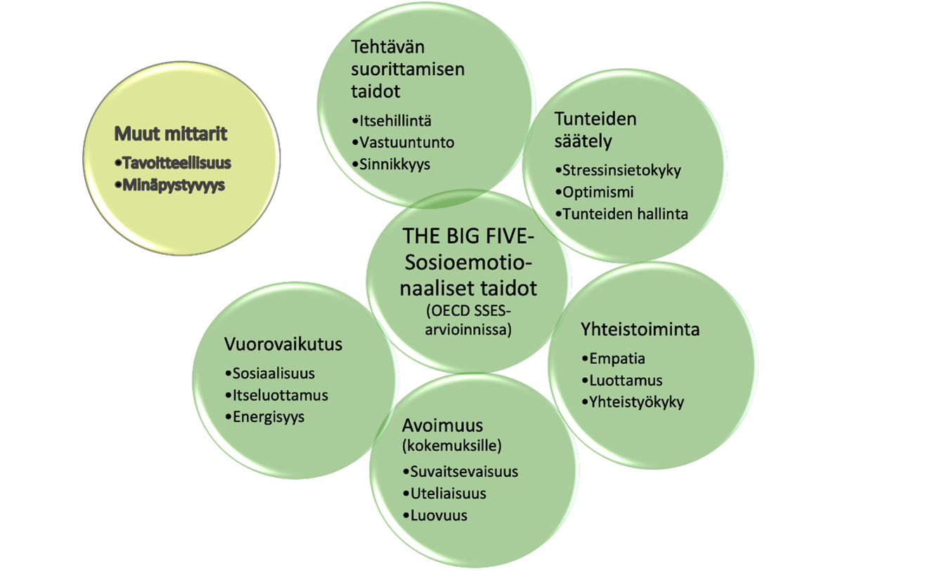 Erityisesti Amerikassa tunnettu järjestö Collaborative for Academic, Social and Emotional Learning (CASEL) on luonut viitekehyksen näiden viiden osa-alueen ympärille ja tuottanut runsaasti materiaalia menetelmän koulumaailmaan integroimisen tueksi. (8) Kansainvälinen taloudellisen yhteistyön ja kehityksen järjestö OECD (Organisation for economic co-operation and development) on luonut arviointimenetelmän, jota käytetään myös Suomessa sosioemotionaalisten taitojen mittaamiseen. OECD:n arviointi pohjautuu tunnettuun Big Five -malliin (ks. kuvio 2), ja mitattavia sosioemotionaalisia taitoja siinä on yhteensä 17 (9,10).