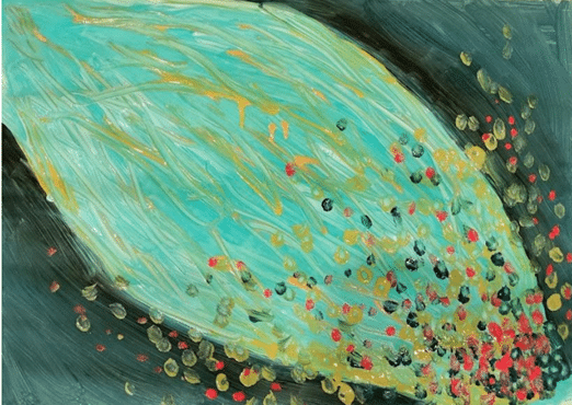 Tutkimuksessamme meissä oleva sanaton tieto tuli näkyväksi maalauksissa olevien värien, muotojen ja suuntien kautta. Maalauksista kirjoittaminen auttoi saamaan keholliset kokemukset sanalliseen muotoon. Taidetyöskentelyn aikana havaitsimme sisäisen tilamme ja olimme taidetyömme kanssa vuorovaikutuksessa (5). Heittäytyminen luovaan ilmaisuun oli meille luontaista ja tuttua aiemman kokemuksen myötä, minkä vuoksi saavutimme nopeasti riittävän turvallisuuden tunteen.