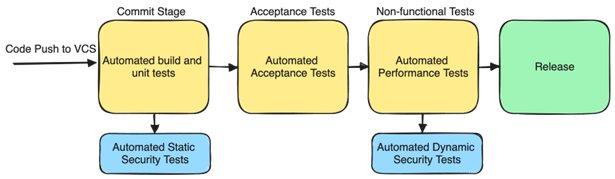The deployment pipeline in Figure 1 is triggered by a change to the software’s code base and is then followed by multiple stages of testing. Finally, if tests are successful, the software should reach a releasable state. Given that the team is already working with a deployment pipeline, it presents an opportunity to integrate automated security tests into this process.