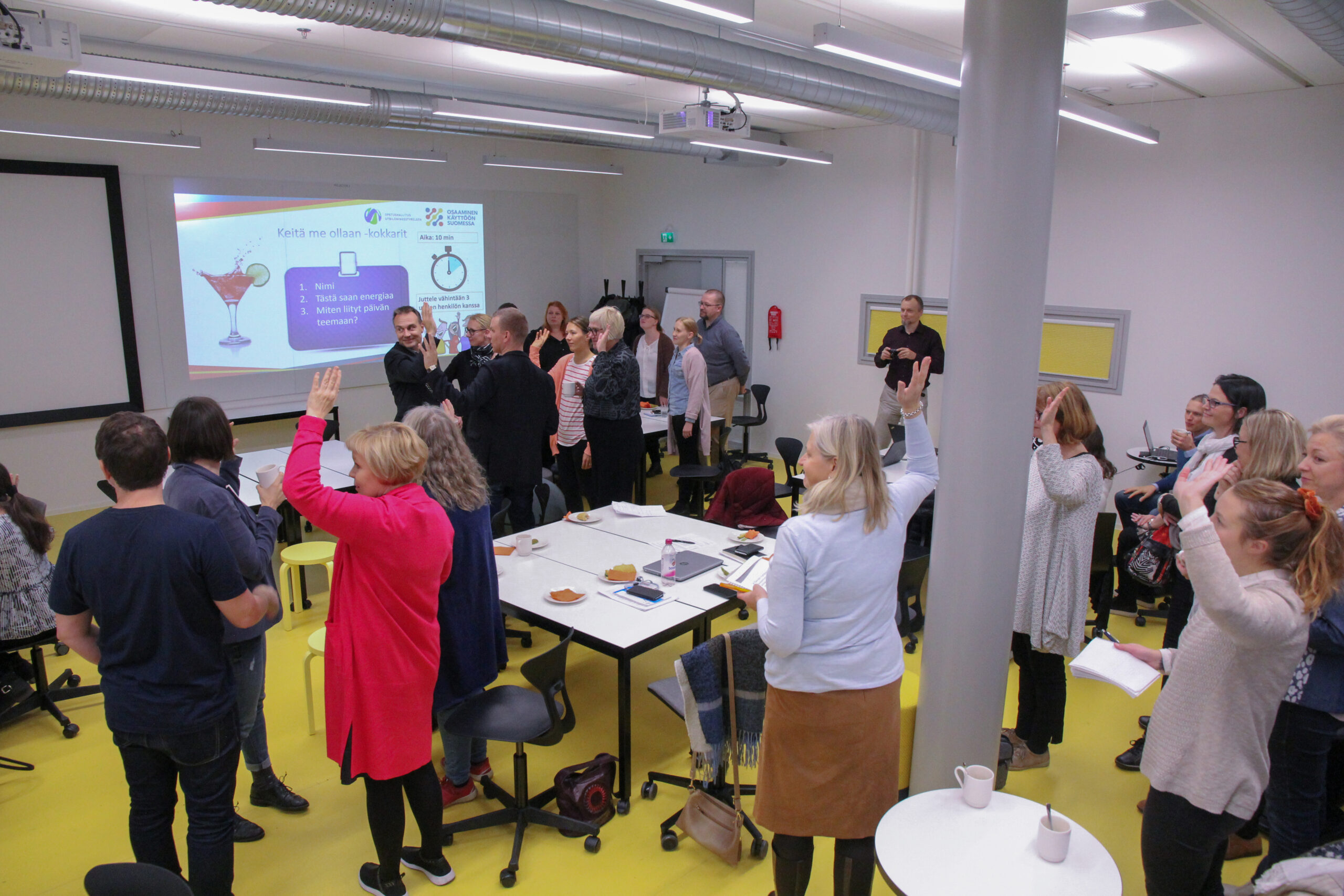 Metropolian asiantuntevat ja innostavat fasilitaattorit ovat tuoneet SIMHE-työpajoihin osallistamiseen tarvittavaa ammatillista tukea (11.). Fasilitoijat ovat suunnanneet työskentelyä kohti yhdessä etukäteen määriteltyjä tavoitteita ja antaneet projektipäällikölle mahdollisuuden osallistua tasavertaisena keskusteluun tuoden työskentelyyn myös ulkopuolisin lasein tarvittavan tarkastelun. Fasilitaattoreiden ansiosta työpajatyöskentelystä on tullut myös hauskaa ja hyvin johdettua. Uskallankin väittää sekä Metropolian sisäisten että ulkoisten SIMHE kumppaneiden allekirjoittavan tämän ja tietävän, mitä tarkoittaa, jos sanon nyt nostavani käden pystyyn.