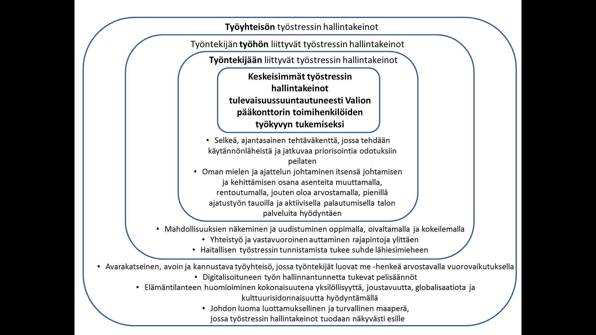 Kuvio 1. Keskeisimmät työstressin hallintakeinot tulevaisuussuuntautuneesti toimihenkilöiden työssä Valion pääkonttorilla työkyvyn tukemiseksi