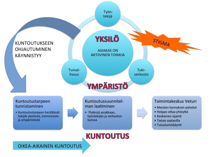 Etelä-Karjalan sosiaali- ja terveyspiirissä (Eksote) toteutettiin tutkimuksellinen kehittämistyö, jossa kehitettiin asiakkaan ohjautumista psykososiaaliseen kuntoutukseen mielenterveys- ja päihdevastaanotoilta Toimintakeskus Veturiin. Tarkoituksena oli vahvistaa asiakkaan toimintakykyä. Tulokset osoittavat, asiakkaan aktiivisen toimijuuden tukeminen on tärkeää psykososiaaliseen kuntoutukseen ohjautumisessa.