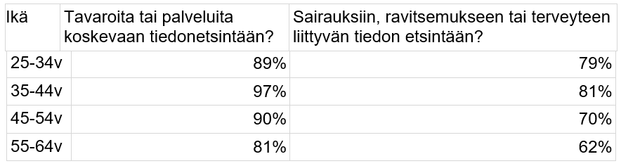 Alla olevassa Tilastokeskuksen tutkimuksen tiivistelmässä (2018) näkyy vastaukset muutaman aihepiirin osalta. Siinä kysyttiin, ”oletko käyttänyt nettiä edellisen kolmen kuukauden aikana”: