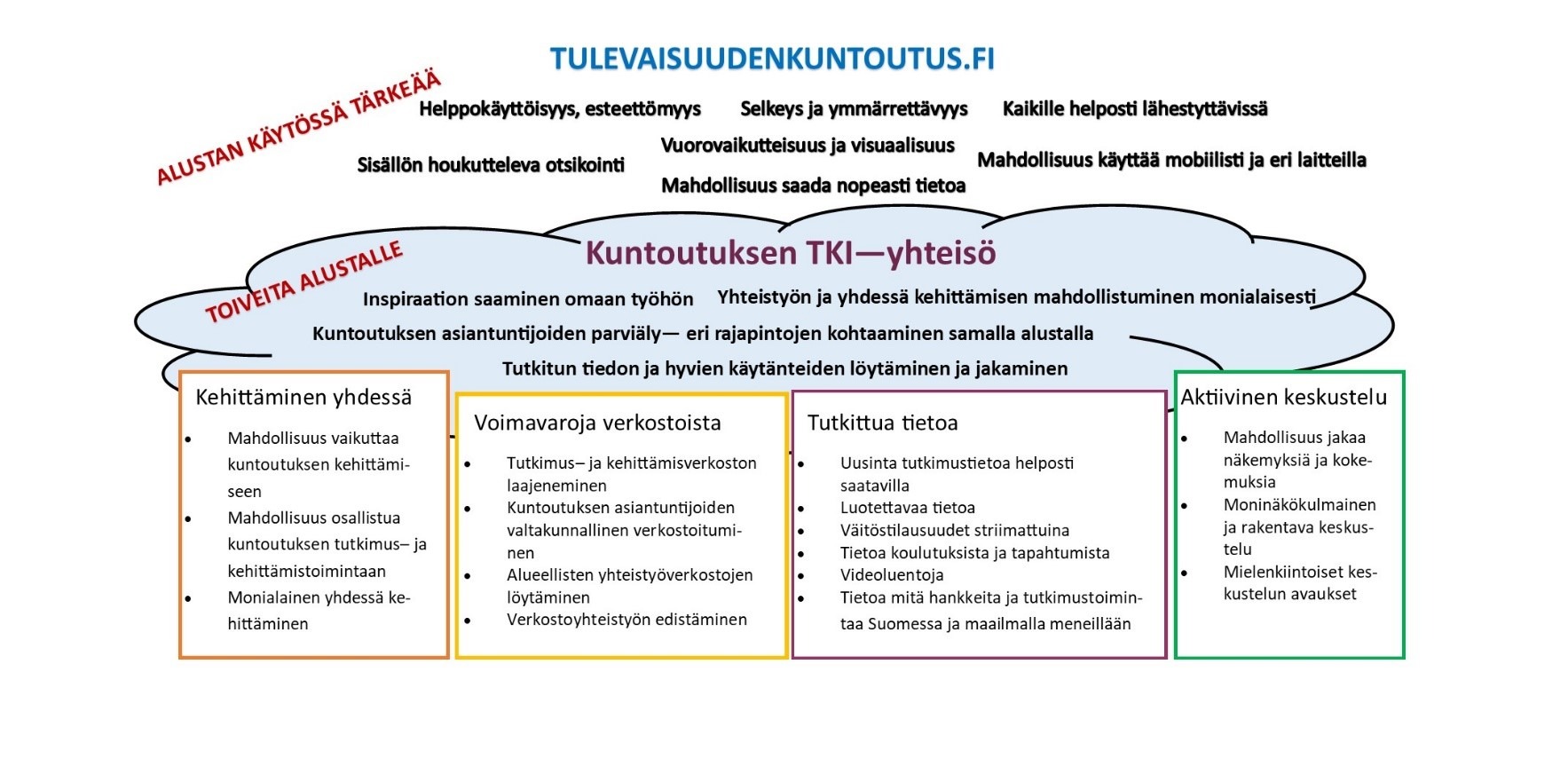 Tulevaisuudenkuntoutus.fi-alustalta toivottiin helppokäyttöisyyttä, visuaalisuutta, esteettömyyttä ja selkeyttä. Keskeinen ja toistuva toive oli mahdollisuus löytää uusinta, helposti saavutettavaa ja ymmärrettävää tutkimustietoa kuntoutuksesta suomen kielellä. Alustalle olisi hyvä koota kuntoutuksen eri hankkeet Suomessa, kansalliset ja kansainväliset kuntoutustapahtumat sekä väitöstilaisuudet mahdollisuuksien mukaan etäyhteyksin ja verkkoon striimattuna.