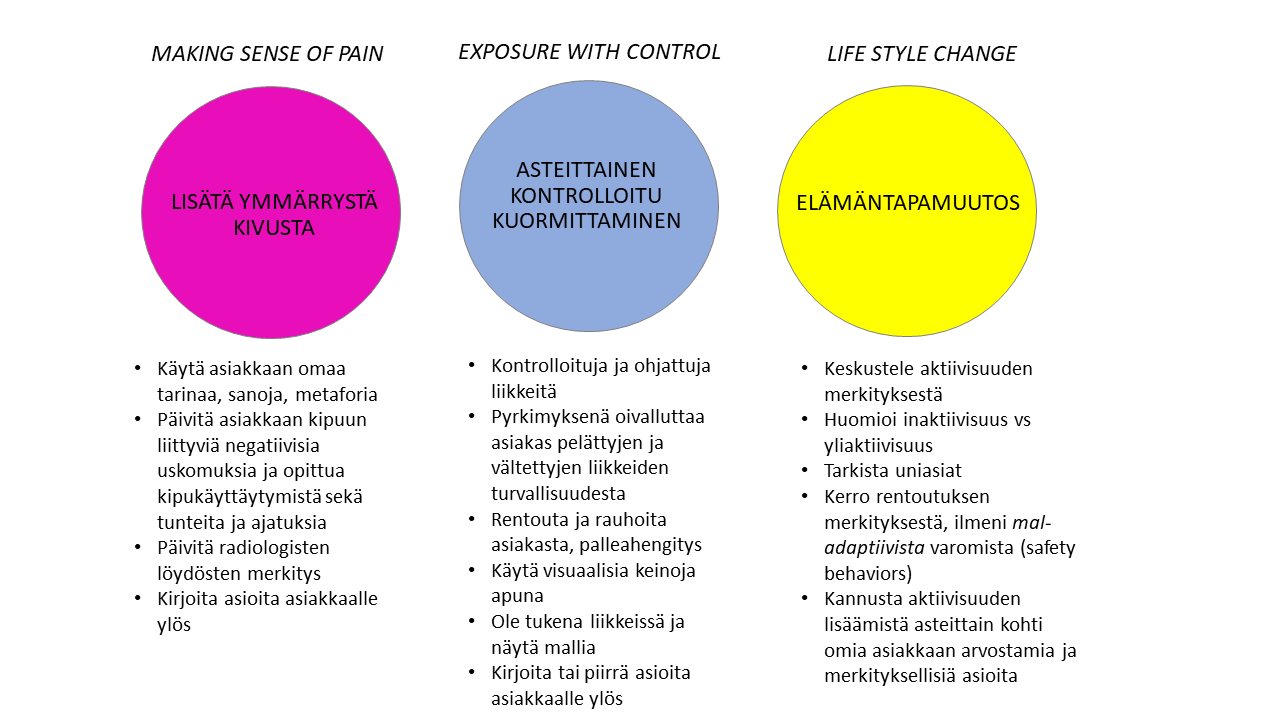 Yhtenä tärkeimmistä seikoista on asiakkaan validointi ja kuulluksi tuleminen sekä saada selville hänen näkemyksensä selkäkivun syistä. Haastattelun aikana huomioidaan mahdollisesti esille tulevia selkäkipuun liittyviä haitallisia uskomuksia. Uskomukset tulee päivittää uuden tutkitun tiedon mukaisiksi. Esimerkiksi asiakkaalla saattaa olla tiedossaan magneettitutkimusten pohjalta selän rakenteiden muutoksia, jotka ovat vaikuttaneet hänen arkikäyttäytymiseensä siten, että se entisestään alentaa selän toimintakykyä.