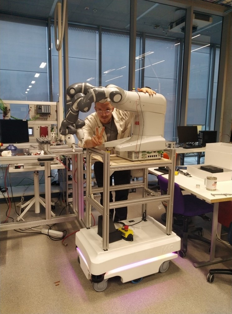 Yritys Oinride Oy ja Metropolian opiskelijat kokeilemassa AutoJoe-mobiilirobottia kaivosympäristössä (Oinride-yrityksen robotti)