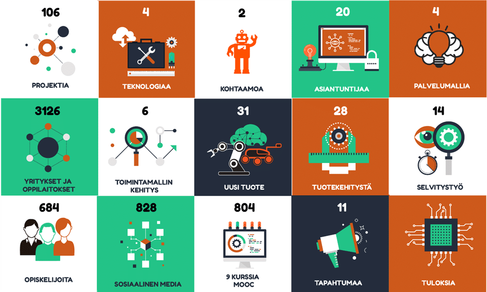 Hankkeessa toteutettiin 106 projektia kolmessa projektimallissa, pienestä suvituulesta salaman kautta isoihin myrskyihin. Näissä projekteissa saatiin merkittäviä tuloksia aikaiseksi sekä paljon konkreettisia simulaatioita, protoja ja testejä. Uusien tuotteiden ja tuotekehityksen parissa tehtiin erityisesti projekteja, kuten näette kuvasta 1. Yritysten palaute oli positiivisesti yllättynyttä ja innostunutta siitä, mitä hankkeessa saatiin aikaan. Projektimallit tukivat prosessia merkittävästi ja erityisesti yritysten sitoutuminen varmisti parhaimmat tulokset.