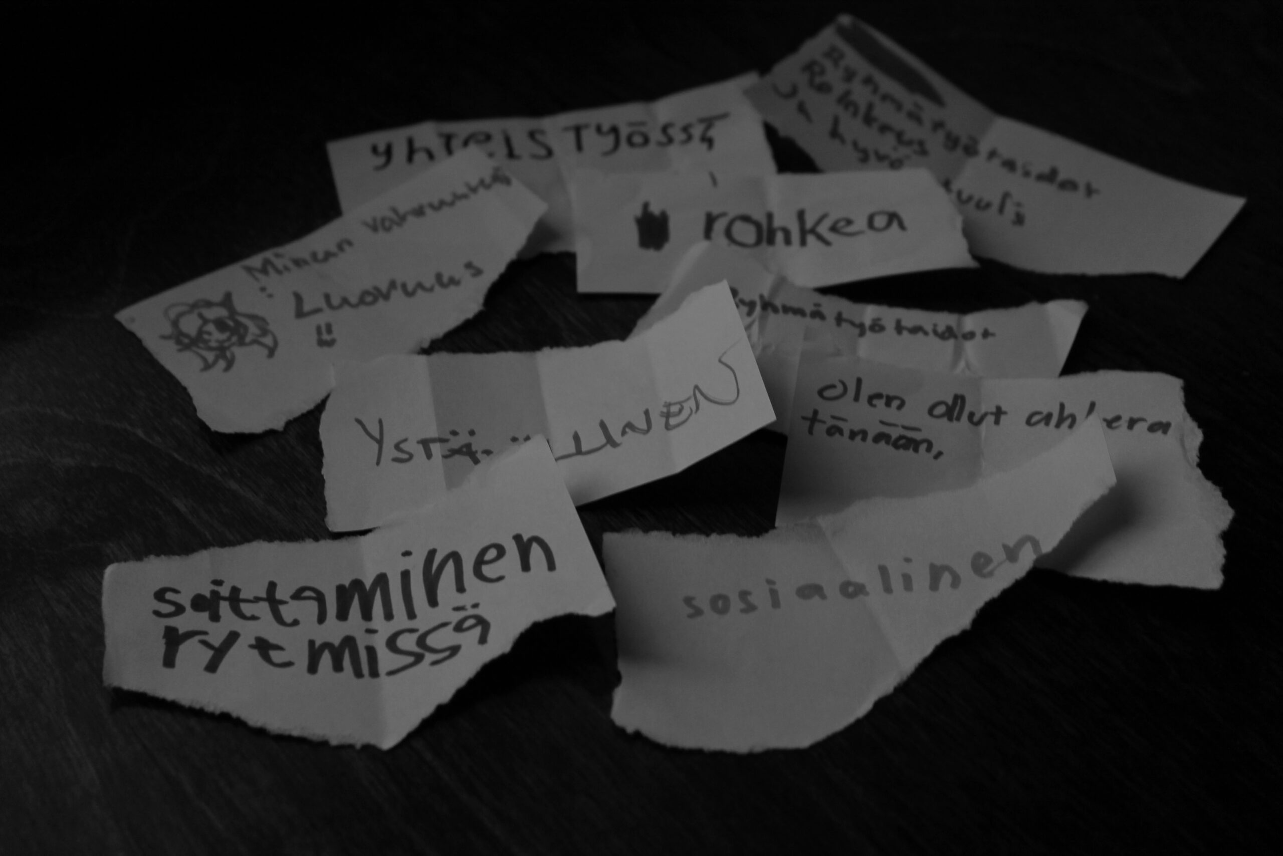 Innostuin Tämä elämä -hankkeesta heti, kun kuulin siitä. Siinä saisi soveltaa taiteen ja musiikin käyttöä erityispedagogiikkaan sekä tavata paljon uusia, erilaisia ihmisiä. Nyt ensimmäisen pilottijakson loputtua voin sanoa, että koko matka koulutuksineen, kohtaamisineen ja keskusteluineen on ollut todella opettavainen ja inspiroiva. Lähdin jokaisesta koulutuspäivästä pää täynnä ideoita harjoituksista, joita koululaisten työpajoissa voisi käyttää. Olin inspiroitunut, innostunut ja monena päivänä myös liikuttunut kaikkien vilpittömästä halusta auttaa nuoria löytämään oma polkunsa vahvuuksiensa kautta. Ryhmässämme oli todella ammattitaitoisia, taitavia ja avoimia opiskelijoita, joiden kanssa oli helppoa olla oma itsensä ja uskaltaa heittäytyä. Meidän ohjaajamme taas olivat aivan huippuammattilaisia aloillaan, ja jokaisen koulutuspäivän sisältö tuki toinen toistaan. Ohjaajiemme tuella oli helpompi ja turvallisempi mennä tekemään jotakin, jota ei ollut koskaan ennen tehnyt – ohjaamaan erittäin heterogeenistä kuudentoista hengen yläkouluryhmää. Ensimmäisenä päivänä jännitti niin, että kädet tärisivät, kun kirjoitin nuorten nimiä maalarinteipin palasiin ja toivotin heidät tervetulleiksi. Jännitys kuitenkin laukesi pian, kun pääsimme tekemään töitä ryhmän kanssa. Meille kävi työparini Veeran kanssa heti selväksi, miten aivan ihania, taitavia ja viisaita nuoria meidän ryhmässämme oli. Vaikka kaikkia aluksi hieman jännitti uudet ihmiset, niin työpajapäivän loppupuoliskolla kilpailtiin jo innokkaasti tunnetilalaulukisassa: esitimme Veeran kanssa lauluja erilaisilla tunnetiloilla ja muut arvailivat joukkueittain. Lopuksi muutama ryhmäläinenkin uskaltautui mukaan lauluun! Vahvuudet ja niiden pohtiminen oli minulle todella suuri ja tärkeä osa työpajojen suunnittelua. Teimmekin vahvuuksien pohtimisesta jokaiselle päivälle omanlaisensa lopetuksen. Ensimmäisenä päivänä huomioimme jokaisesta nuoresta yhden vahvuuden ja sanoimme sen ääneen. Oli ihanaa huomata, kuinka mukavan asian sanominen ja vahvuuksien huomioiminen sai toiset hyvälle tuulelle. Tuli sellainen olo, että tätähän pitäisi aina tehdä. Toisten kehuminen on tärkeää, ja silti usein ne pienetkin hyvät asiat unohdetaan sanoa ääneen. Opin sen, että yksilöllisellä kehulla on todellakin voimaa ja sitä pitäisi viljellä niin paljon kuin sielu sietää! Toisena päivänä nuoret saivat huomioida itse omat vahvuutensa: he saivat kirjoittaa pienelle paperinpalalle, missä olivat olleet sinä päivänä hyviä. Saimme ihania vastauksia – monenlaisia vahvuuksia. Oli hienoa nähdä, että vahvuuksia osattiin miettiä omasta itsestä, vaikkei se aina ole helppoa! Kuva: Emilia Vihanto Kolmas työpajapäivä päättyi vahvuusrinkiin, jossa jokainen sanoi ääneen oman vahvuutensa sinä päivänä. Jos joku ei keksinyt, niin kaverit auttoivat: positiivisia asioita ja vahvuuksia sateli spontaanisti eri puolilta rinkiä, ja se sai minut tuntemaan suurta ylpeyttä nuoria kohtaan. Neljännen päivän lopetus meni hiukan samalla tavalla, kun nuorten tuli kirjoittaa pareittain heidän huomaamiaan vahvuuksia toisistaan. Useat olivatkin huomanneet useamman kuin yhden vahvuuden – mahtavaa! Tämä elämä -pelin kehittäminen oli myös iso osa työpajojen ohjelmaa, ja nuoret olivat selvästi kiinnostuneita siitä. Teimme toisena päivänä musiikin peliin elementti-improvisaation keinoin, ja valitsemamme tunnetilat musiikille olivat rentouttava, iloinen ja rauhallinen. Pohdimme, mitkä soittimet tuottaisivat tämänlaisia ääniä. Yhdeltä oppilaalta tuli hieno idea äänittää oikeaa veden lotinaa. Lopputuloksena oli juuri se, mitä olimme tavoitelleet: rauhaisa ja iloinen musiikki täynnä luonnon ääniä. Oppilailta tuli myös hyviä kehitysideoita peliin, ja pelimaailma musiikkeineen oli selvästi keskustelua avaava ja mielenkiintoinen aihe nuorille. Kysyimme viimeisenä päivänä palautteessa, mikä työpajapäivissä oli ollut kivointa. Monet vastasivat, että musiikinteko. Sitä olisi saanut myös palautteen mukaan olla enemmän, samoin kuin pelin kehittämistä. Jotkut pelit ja leikit olivat olleet tylsiä, mutta kaikki olivat kuitenkin iloisia siitä, että olivat olleet ryhmässä erilaisten nuorten kanssa ja tutustuneet uusiin ihmisiin. Mitä minä opin Tämä elämä -hankkeesta? Ainakin todella arvokkaita ryhmänohjaustaitoja. Opin itsestäni uusia asioita, samoin nuorista. Opin toimimaan työparin kanssa, joka on eri alalta. Opin kuinka tärkeää on se, että toisissa huomataan hyvä ja se sanotaan ääneen niin, että kaikki muutkin kuulevat. Sain luottamusta itseeni ohjaajana. Kysyimme oppilaspalautteessa myös, mitä nuoret olivat oppineet. Yksi mieleenpainuvimmista vastauksista kuului näin: ”Opin olla rohkeampi”. Sitä minäkin opin, ja opettelen edelleen. Emilia Vihanto Musiikkipedagogiikan opiskelija, Metropolia Ammattikorkeakoulu Kuva: Emilia Vihanto