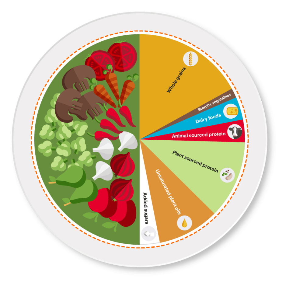Planetaarisen ruokavalion päivittäinen kokonaiskalorimäärä on noin 2500 kcal/ vrk. Ruokavalio on kasvispainotteinen ja se koostuu pääosin täysjyväviljoista, kasviksista ja hedelmistä (500g/vrk), pähkinöistä ja palkokasveista. Marjojen käyttöä ei ole planetaarisessa ruokavaliossa huomioitu. Proteiinin sekä rasvojen lähteet ovat ensisijaisesti kasviperäisiä. Lihaa, kalaa, kananmunia ja kanaa voi syödä hyvin rajoitetusti, maitotuotteita enintään 250 g/ vrk. 7,8