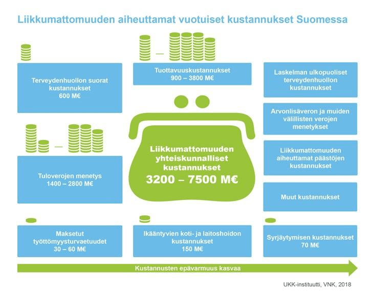 Tiedetään, että liikkumattomuus lisää useiden sairauksien riskiä ja kasvattaa terveydenhuollon kustannuksia, aiheuttaen lisäksi inhimillisistä kärsimystä sairauksien ja toimintakyvyn menetyksen vuoksi. Liikkumattomuuden kustannukset Suomessa ovat suuret 3200- 7500 miljardia euroa vuodessa. (4).