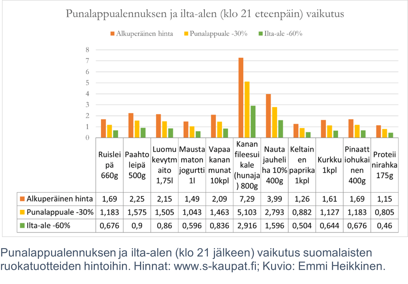 Ruoan hinta nousee ja se näkyy kukkarossa! Elokuussa Tilastokeskuksen mukaan elintarvikkeiden hinnat olivat 12,2 % korkeammat kuin vuosi sitten. Eniten hintaa oli tullut jauhoille, kahville, kananmunille ja tuoreelle kalalle. (9.) Kasvisten suosiminen ruokavaliossa on terveyden kannalta positiivinen asia, mutta ne aiheuttavat kotitalouksissa eniten myös ruokahävikkiä. Ekologisesta näkökulmasta lihatuotteiden joutuminen hävikkiin on erityisen huono asia, sillä niiden tuottaminen kuormittaa runsaasti ympäristöä (8). Ruoan joutuminen roskiin tarkoittaa automaattisesti omien ruokakustannusten nousua.