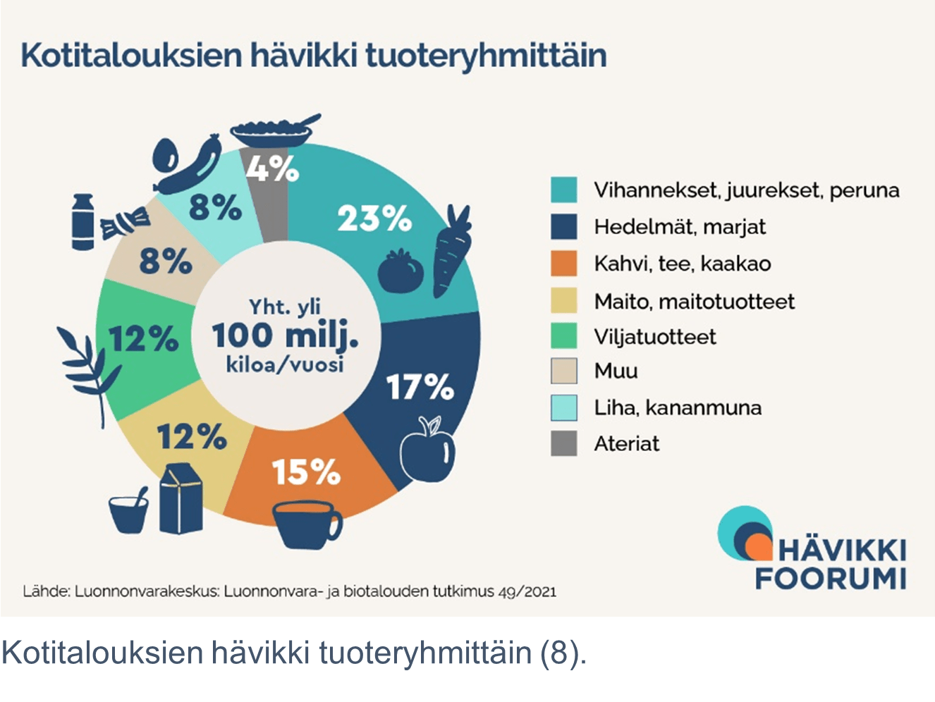 Ruokahävikkiä syntyy huolestuttavan paljon ja siihen kuluu suomalaisilla Luonnonvarakeskuksen arvion mukaan yhteensä noin 500 miljoonaa euroa vuodessa (5.) Kun kolmasosa ihmisravinnosta päätyy hukkaan, voidaan miettiä, missä menee pieleen (6). Pelkästään Suomessa elintarvikejätettä syntyy 643 miljoonaa kiloa, josta puolet on ruokahävikkiä (7). Kotitalouksien aiheuttama ruokahävikki on suurinta mukaan lukien teollisuus, ravitsemispalvelut, kaupat sekä alkutuotanto (8).