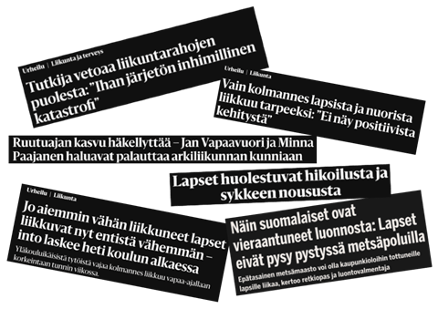 Näiltä otsikoilta ei ole kukaan voinut viime aikoina välttyä. Ne kertovat karua kieltä siitä, että lasten ja nuorten liikkuminen on vähentynyt viime vuosina kiihtyvällä tahdilla. Erityisesti arkiliikkumisen väheneminen on kasvava ongelma. Kävelyä, juoksua, välissä kiipeäminen kivelle, kierros lähimetsässä tai hyppy ojan yli...Näinkin voisi koulumatkaa kulkea, kun puhutaan lapsista, joille aktiivinen koulumatka on mahdollinen. Sallimalla ja kannustamalla lapsia seikkaluihin, luomme heille ajatuksen siitä, että liikkuminen on hauskaa ja sitä voi tehdä missä vain. Luonto onkin lapsille oiva leikkipaikka. On tutkittu, että luonto liikuttaa ja vahvistaa motoriikkaa, tarjoaa elämyksiä, rauhoittaa mieltä ja haastaa mielikuvitusta (1). Kaupungistuminen ja nopea teknologian kehitys on valitettavasti heikentänyt etenkin lasten ja nuorten suhdetta luontoon. Lasten liikkumattomuus Kansallisessa 7–15-vuotiaiden lasten ja nuorten liikuntakäyttäytymistä mittaavassa LIITU-tutkimuksessa selvisi, että lasten ja nuorten liikkuminen on vähentynyt. Tulokset kertovat vain kolmanneksen liikkuvan nykyisten liikkumissuositusten mukaisesti. (2.) Alakouluikäisten reippaan päivittäisen liikunnan määrä laskee iän myötä selvästi (kuvio 1) (3). 7–17-vuotiaille suunnatut liikkumissuositukset painottavat pitkäkestoisen paikallaanolon välttämistä ja suosittelee rasittavaa liikkumista vähintään tunnin päivässä. Kestävyystyyppistä liikuntaa ja lihasvoimaa edistävää liikkumista tulisi harrastaa vähintään kolmesti viikossa. Vapaa-ajan omaehtoisen liikunnan on todettu myös vähenevän alakouluiässä. (3.) Neljällä nuorella kymmenestä fyysinen toimintakyky on niin heikko, että se vaikeuttaa arjessa jaksamista (4). Liikkumattomuus vaikuttaa myös keskittymis- ja tunnesäätelyyn. Vähän liikkuvista lapsista ja nuorista yksinäisyyden tunnetta kokee joka neljäs, kaikkien vastanneiden keskuudessa määrän ollessa joka kuudes. (2.) Miksi lapset eivät sitten liiku? Liikunnan ja terveystiedon opettaja Heidi Rautajoki näkee luonnollisten liikkumisessa syntyvien kehon reaktioiden, kuten hikoilun ja hengästymisen, tuntuvan lapsista jopa vierailta. Osalle lapsista jo pienikin ponnistelu voi saada aikaan vastenmielisiä tunteita. (5.) Lasten ja nuorten liikuntafysiologian dosentti, filosofian tohtori Eero Haapala toteaa myös Fysioterapiaa liikkeellä -podcastissa, että osalla lapsista saattaa esiintyä liikkumiseen liittyviä pelkoja sen aiheuttamien epämukavien kehollisten tuntemusten vuoksi. Haapala katsoo, että lapsia tulisi kuunnella herkällä korvalla, sillä kieli rasituksen ja kivun tuntemusten kuvaamiseen voi olla erilaista kuin aikuisilla. Suomessa liikkumisen pelkoa, eli kinesiofobiaa, on lähestytty lasten osalta vielä vähäisesti. (6.) Kinesiofobiassa toiminta tai liike yhdistyy kipuun. Kipureseptorin ärsytykseen liittyvä tulkinta on seurausta aiemmasta negatiivisesta kokemuksesta, joka voi johtaa liikkumisen välttämiseen. (7.) Viidesosa tytöistä ja neljäsosa pojista pitää liikuntaa tarpeettomana (2). Fyysinen polarisoituminen on yleistä lasten ja nuorten keskuudessa, mutta huomioitavaa on, että vähän liikkuvat lapset ja nuoret ovat aktiivisempia kuin aikuiset, joiden suuntaan signaalia tulisikin lähettää. (6.) Ja kuten tiedetään, koko ajan lisääntyvä ruutuaika on pois lasten liikkumisesta, lukemisesta ja sosiaalisesta kanssakäymisestä. Hallituksen liikuttava yritys saada Suomi liikkeelle Myös uusin hallitus on hallitusohjelmassaan nostanut esiin liikkumattomuuden ja sen aiheuttaman uhkan ihmisten hyvinvoinnille. Suomi liikkeelle -ohjelman tavoitteena on hallituksen mukaan ”kääntää liikkuminen kasvuun jokaisessa ikäryhmässä” (8). Ohjelmassa toimenpiteitä on 16. Kolmas toimenpide on, että perheiden liikunnallista elämää edistetään sisällyttämällä pallo äitiyspakkaukseen ja lisätään neuvoloihin perheliikuntaneuvontaa. (8.) Pallo äitiyspakkaukseen on hieman tuuppaava keino, mutta edistääkö se merkityksellisesti perheiden liikkumista? Perheliikuntaneuvonta kuulostaa hyvältä, mutta se tarkoittaa, että vanhempia neuvoloissa ohjaavilla ihmisillä pitäisi olla asiantuntemusta neuvonnan toteuttamiseen. Ensimmäisenä toimenpiteenä ohjelmassa onkin vahvistaa liikuntaosaamista eri koulutusaloilla (8). On positiivista, että monialaisen liikuntakasvatuksen ja -neuvonnan tärkeyteen on vihdoin herätty päättäjätasollakin. Pelkona kuitenkin on, että työ tulee kasaantumaan muutenkin jo ylikuormitettujen sote- ja kasvatusalan työntekijöiden harteille. Tälläkin hetkellä esimerkiksi Länsi-Uudellamaalla suunnitellaan muutamien neuvoloiden sulkemista ja neuvolapalveluihin varatulla budjetilla perheiden tarpeisiin tai lain vaatimiin asiakasmitoituksiin on vaikeaa vastata. (9.) Neljäs toimenpide on vahvistaa lasten päivittäisten kodin ja päiväkodin tai koulun välistä liikunnallistamista sekä koulupäivien yhteydessä tapahtuvaa harrastamista (8). Agenda 2030 on YK:ssa vuonna 2015 sovittu kestävän kehityksen globaali toimintaohjelma. Toimintaohjelmassa mainittuja tavoitteita ovat muun muassa terveyttä ja hyvinvointia kaikille, tasa-arvon saavuttaminen, eriarvoisuuden vähentäminen ja ilmastotekoja. (10.) Jan Vapaavuoren ja Minna Paajasen Pysy liikkeellä -kirjassa puhutaan liikkumattomuuden yhteiskunnallisesta hintalapusta. Kirjassa nostetaankin hyvin esiin, kuinka liikkumattomuus on monitahoinen, globaali riskitekijä ihmisten hyvinvoinnille ja terveydelle sekä kuinka laaja-alainen vaikutus liikkumattomuudella on esimerkiksi kestävään kehitykseen, resilienssiin ja yhteiskunnan yleiseen toimintakykyyn. Puhutaanpa kirjassa myös siitä, kuinka koko systeemin pitää muuttua, tuuppaavista tavoista kannustaa ihmisiä liikkeelle ja liikkumisen positiivisista vaikutuksista ilmastoon, kun esimerkiksi valitsee pyöräilyn autoilun sijaan. (11.) Kunpa päättäjät ymmärtäisivät kuin
