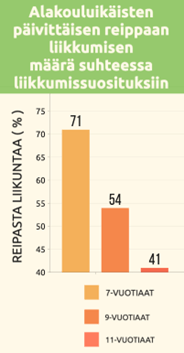 Kansallisessa 7–15-vuotiaiden lasten ja nuorten liikuntakäyttäytymistä mittaavassa LIITU-tutkimuksessa selvisi, että lasten ja nuorten liikkuminen on vähentynyt. Tulokset kertovat vain kolmanneksen liikkuvan nykyisten liikkumissuositusten mukaisesti. (2.) Alakouluikäisten reippaan päivittäisen liikunnan määrä laskee iän myötä selvästi (kuvio 1) (3).