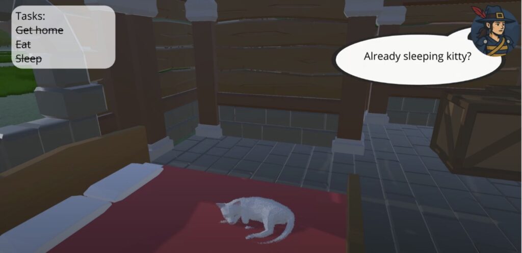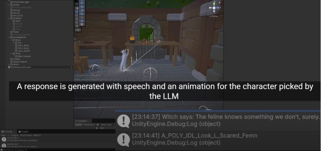 The team’s prototype, Purr-suit of Attention, flips the classic power dynamic between player and NPC. Instead of commanding the world, the player steps into the paws of a curious cat living with an AI-powered fantasy witch – a non-playable character that responds dynamically to everything the cat does. The task of the game is to explain to the AI what the cat wants to use different activities and make the NPC do a certain action.