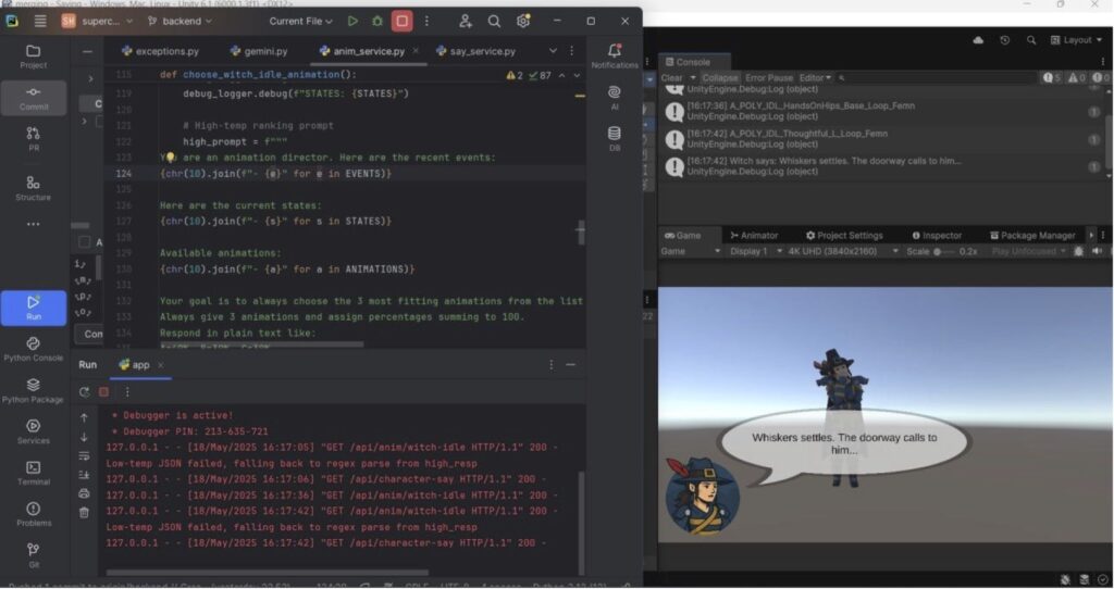 Actions taken by the cat are tagged and flagged as events (meow, jump, scrap, etc) and states (looking at and near objects). These are processed by the backend, where the AI evaluates them in context using techniques like high-low temperature, prompt enhancement (system, static and dynamic prompts; moving “IMPORTANT” flag), reattempts, and random selection according to heightening parameters from the AI response. The result? A witch NPC that doesn’t just respond – she feels alive, true (but a little bit “slow-witted person” because the response from free LLM’s API takes some time😊).