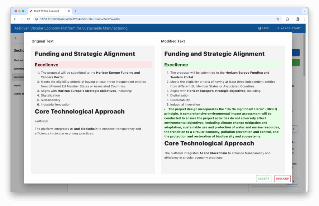 In EU Horizon funding calls in particular, it is crucial that every section of the call for proposals is addressed within the application. Even a strong application can be rejected if it fails to mention even a single sub-point. Grant Writing Assistant automatically analyzes the call for proposals and compares it with the content of the application. Any missing elements are clearly reported to the user, who can then choose to correct them manually or have the AI automatically insert the missing content. The tool is also capable of identifying risks and breaking the project down into work packages.