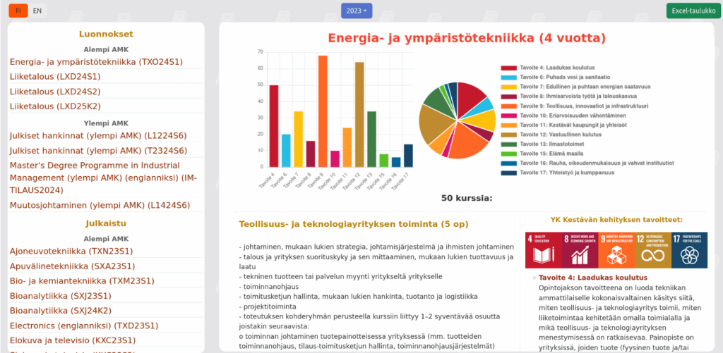 Writing curricula is a time-consuming process. Each course-level curriculum should reflect both the goals of sustainable development and Arene competencies. To support this, we developed the Curriculum Tool, which analyzes curricula and visualizes the content of degree programs from the perspectives of Arene competencies and sustainable development. In the development of this tool, Metsälintu Pahkin played a valuable role as a liaison with the degree coordinators. You can read the scientific publication describing the tool for more details.