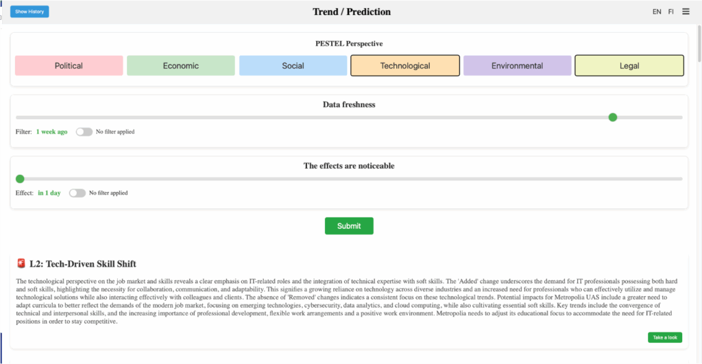 Foresight has taken on an increasingly important role at Metropolia — everyone is expected to anticipate future developments, but how? We set out to address this challenge with the Oracle tool, which ingests online content such as news articles and job postings. Based on this input, we can analyze the data using vectorization and clustering techniques. We have already developed methods for identifying weak signals and megatrends, detecting drivers of change, conducting data-driven scenario work and implementing an automated multi-agent version of the Delphi method.
