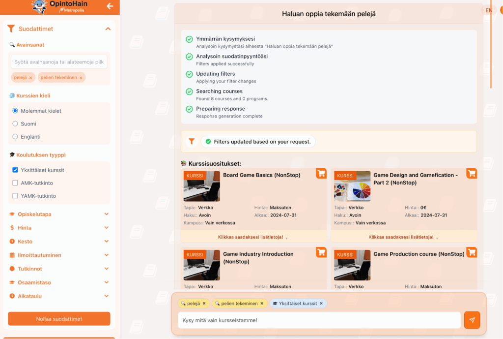 We responded to the challenge by developing a chatbot that understands the course offerings of Metropolia’s Open University. The tool is powered by a RAG (Retrieval-Augmented Generation) model that is familiar with Metropolia’s courses and degree programs. It also includes a multi-agent system with dedicated agents for course and degree recommendations, as well as for study guidance. The OpintoHain tool is available for testing on Metropolia’s website.