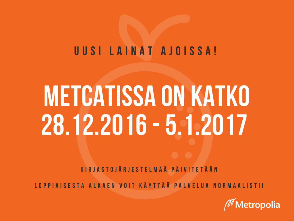 Kirjastojärjestelmäämme päivitetään 28.12.2016-5.1.2017. Tuona aikana MetCatin toiminnassa on rajoituksia. Uusi lainat ajoissa ennen päivitystä! Päivityksen aikana MetCatissa ei voi katsoa omia lainoja tai uusia niitä tehdä varauksia kirjautua kirjastokortin tiedoilla Päivityksen aikana MetCatissa voi kirjautua Metropolian verkkotunnuksilla (haka login) tehdä aineistohakuja käyttää e-aineistoja Pahoittelemme päivityksestä aiheutuvia käyttörajoituksia. Loppiaisesta alkaen voit käyttää taas MetCatia normaalisti!