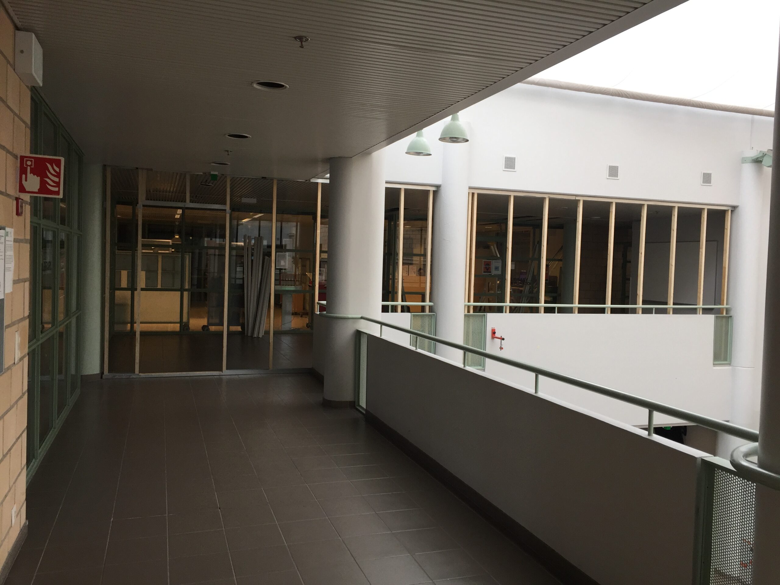 Syksyllä kaikki lisärakennuksen puolella olevat ikkuvat peitettiin palosuojalevyillä. Kirjasto on tuolla toisessa kerroksessa pimeän puolella.