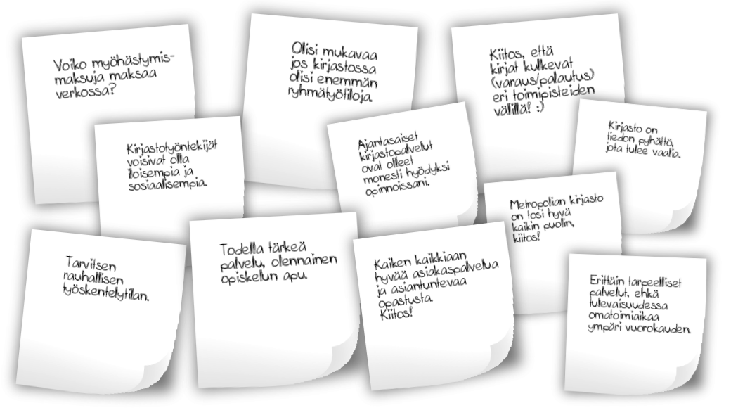 84% vastaajista piti Metropolian kirjaston palveluja kokonaisuutena melko tai erittäin hyvänä. Haluamme kuitenkin kehittyä ja siksi perehdyimme vastauksissa tarkemmin sanallisiin palautteisiin. Työstimme vastauksia työpajassa, jossa ryhmittelimme palautteita aiheen mukaisesti. Sen jälkeen jaoimme lajitellut palautteet niille tahoille kirjastossa, jotka voivat parhaiten niitä hyödyntää, kun kehittävät kirjaston palveluja.