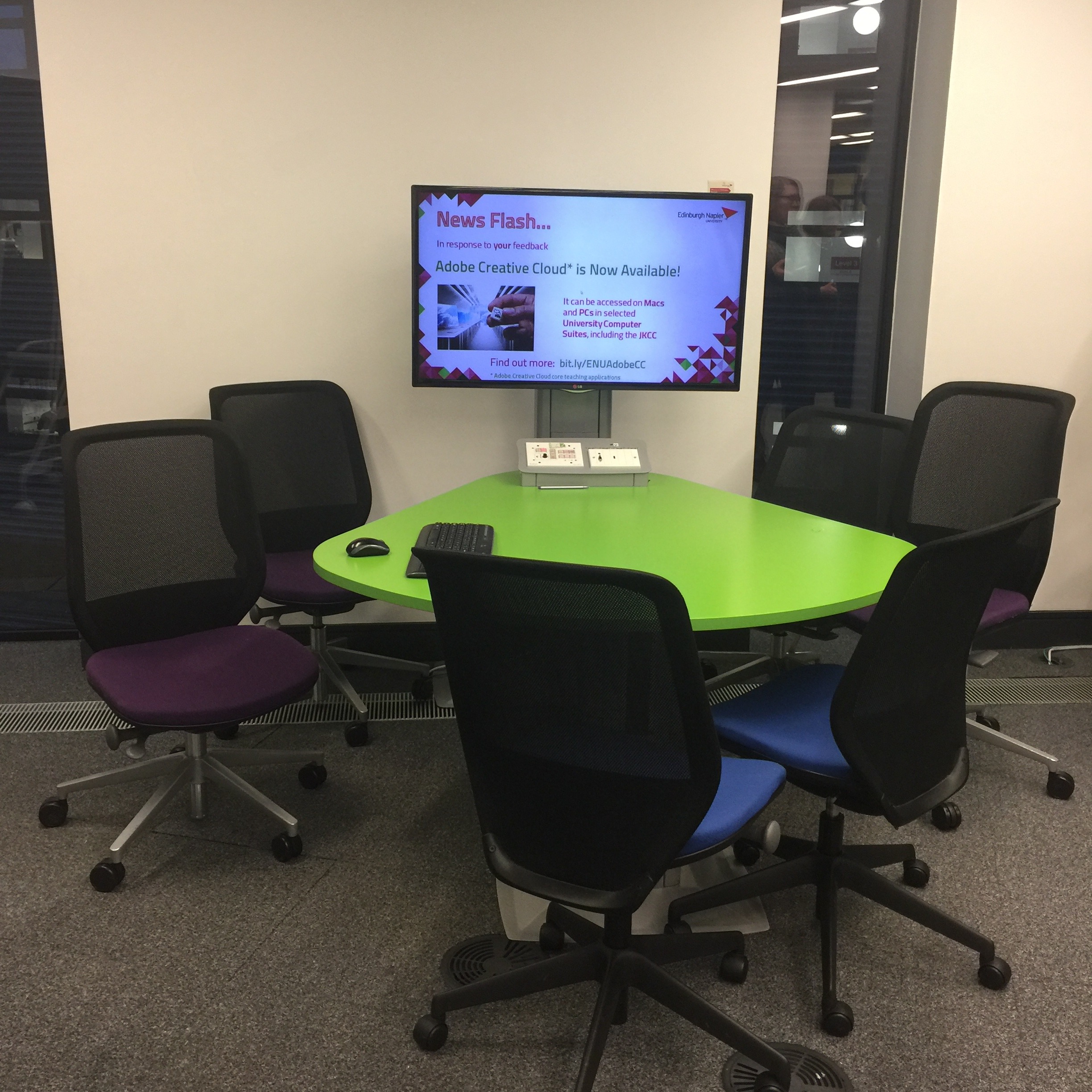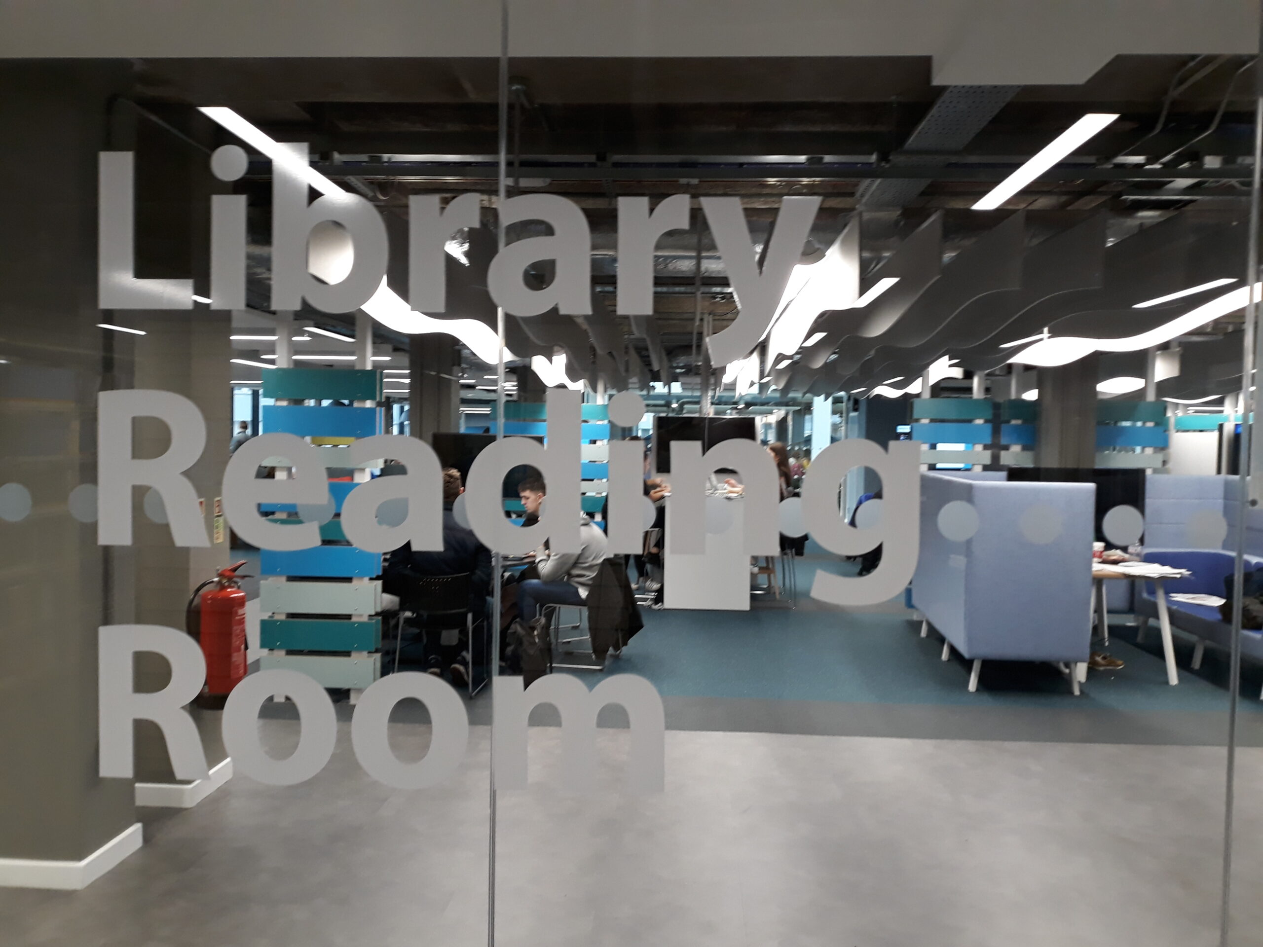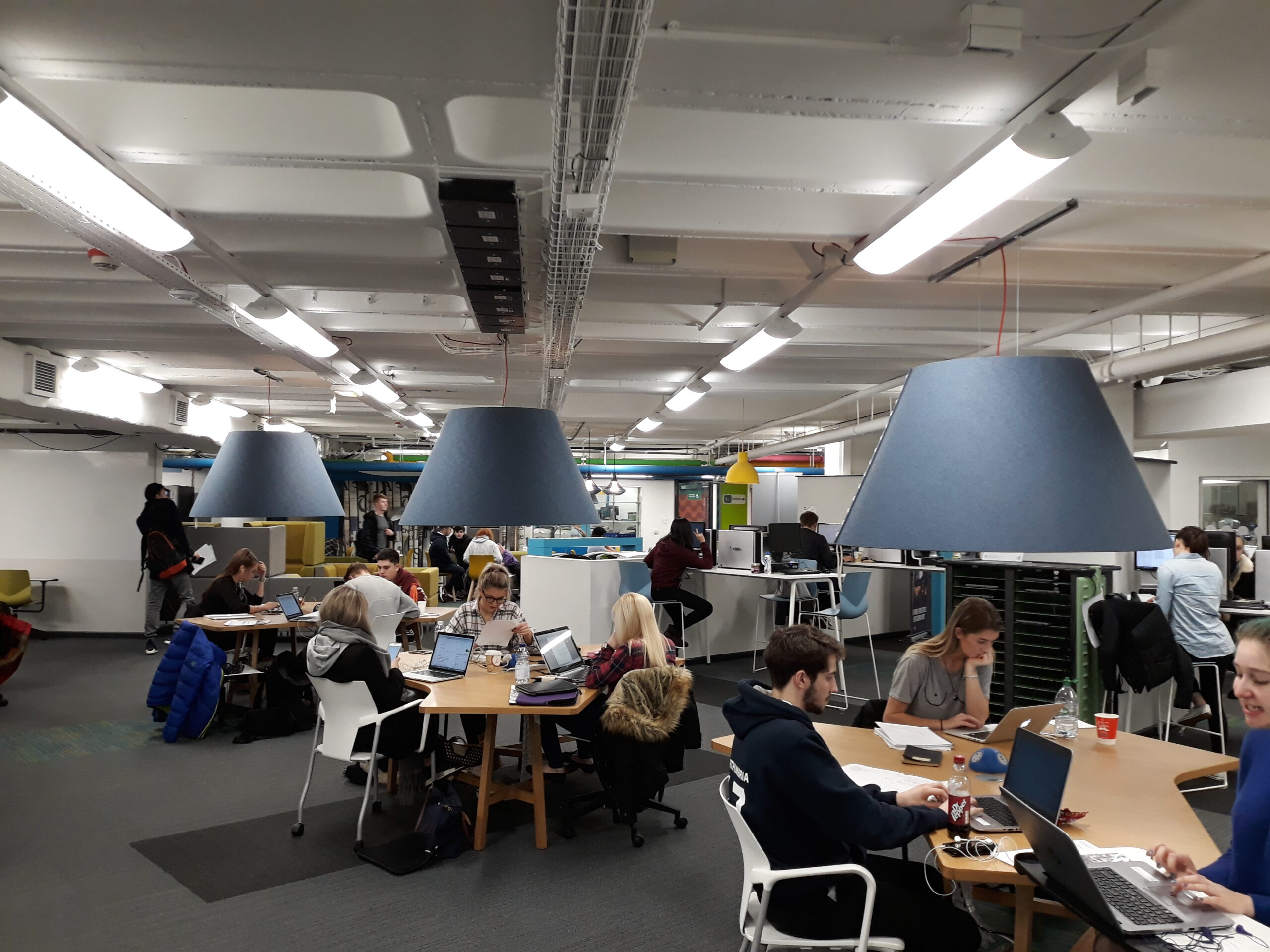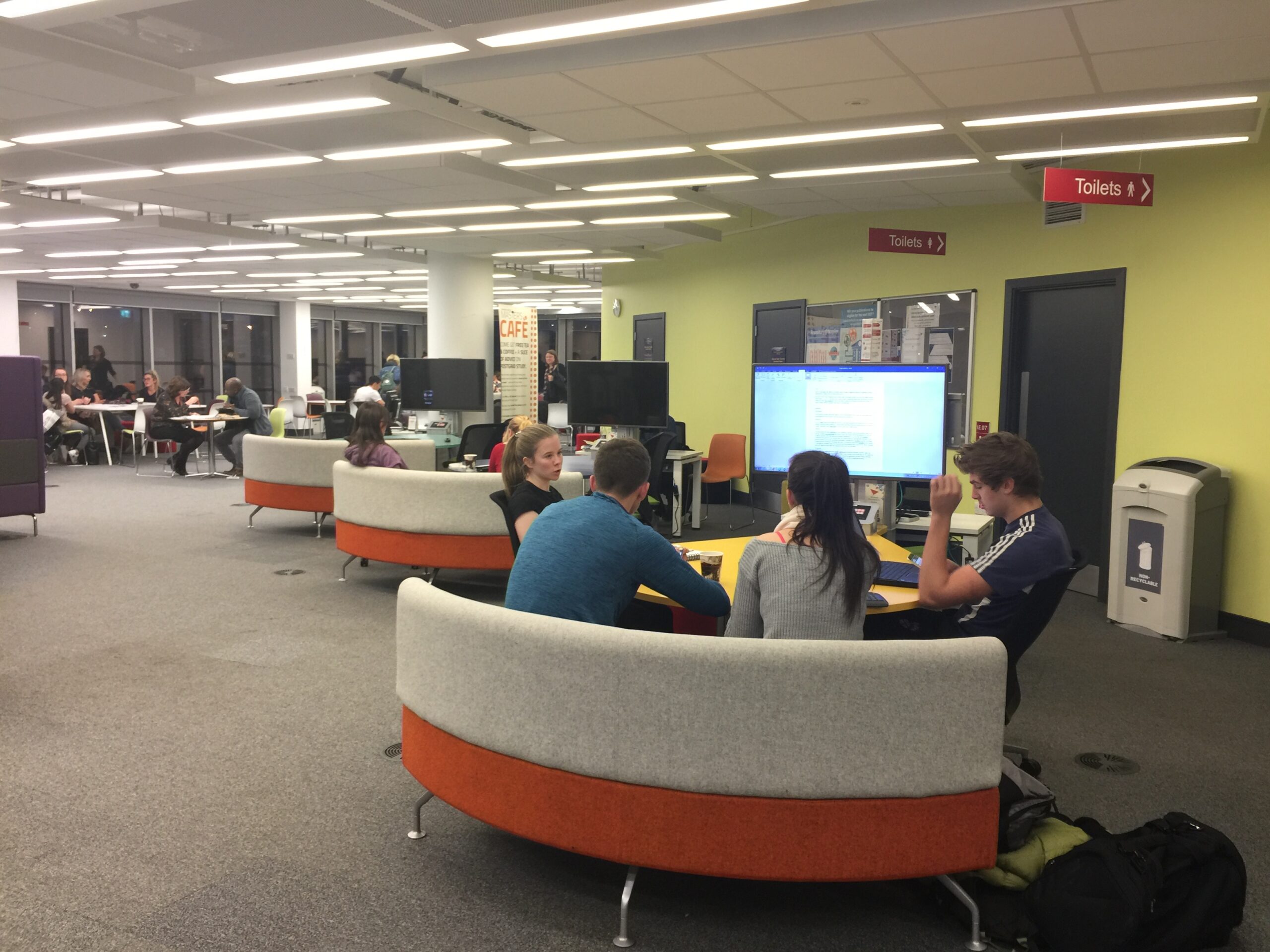 Kirjaston ja muiden korkeakoulupalvelujen perustason asiakaspalvelu hoidettiin Ask4help-pisteessä, joka on avoinna yötä päivää.Library Reading Room ei ollutkaan hiljainen lukusali, vaan monipuolisen ryhmätyöskentelyn mahdollistava tila.Kuvan työskentelypisteiden yläpuolella on akustoivat varjostimet.Työskentelytilaa on erittäin monenlaista – jokaiselle jotakin!