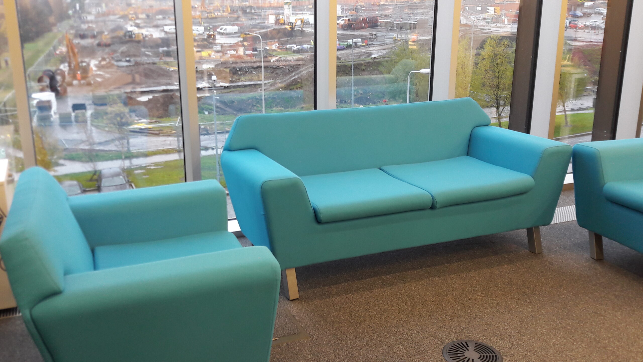 Kalusteilla voidaan luoda rauhallisempaa ryhmätyöskentelytilaa.Iso ruutu auttaa ryhmätyöskentelyssäKirjastossa ei ole koskaan liikaa tietokoneita!Opiskella voi myös kotoisasti sohvalla. Taustalla tutunoloisesti rakennustyömaa.