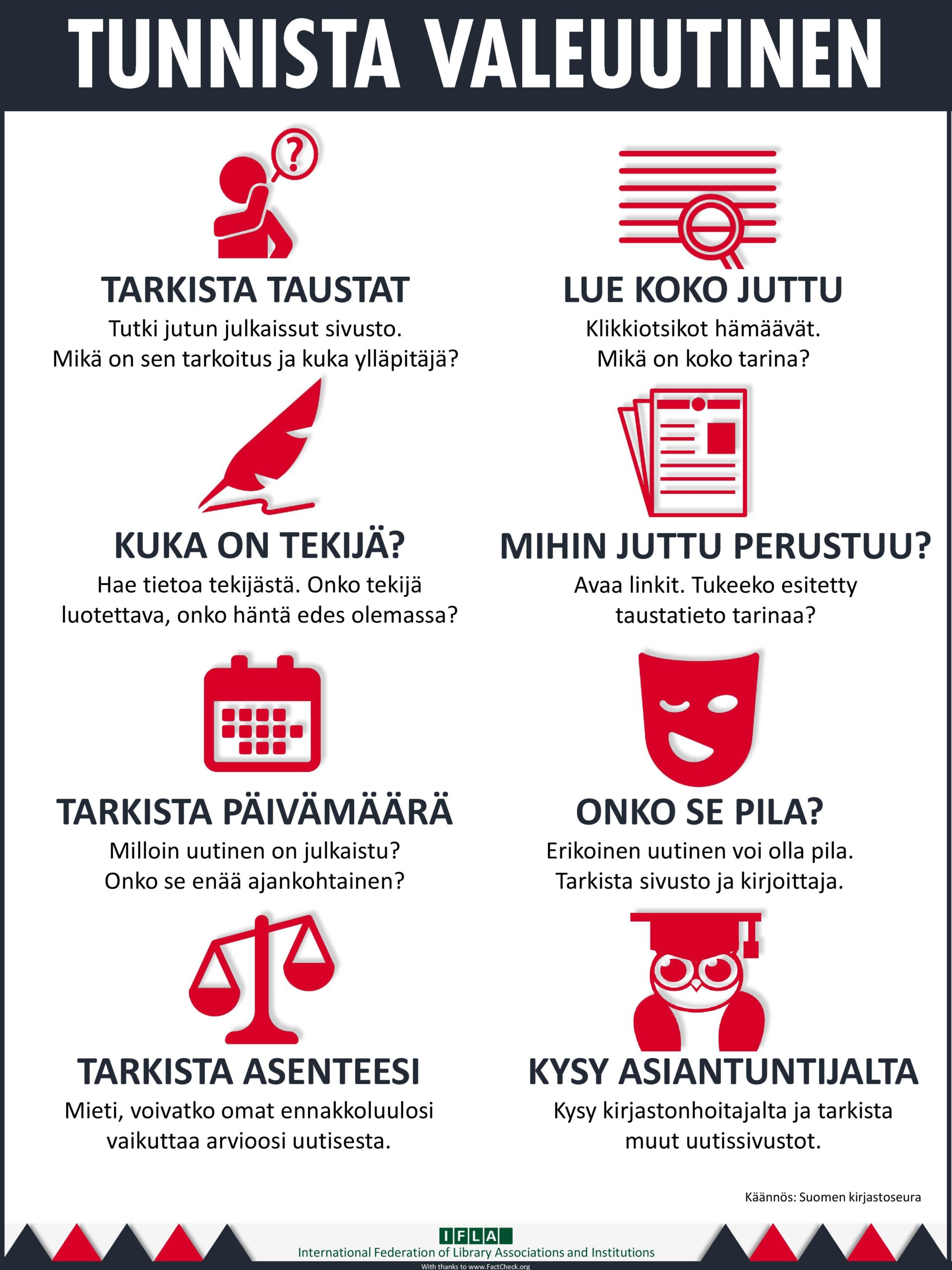 Käytännön vinkkejä luotettavuuden arviointiin. Lähde: Suomen kirjastoseura /IFLA