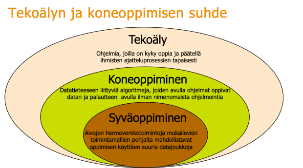 [caption id="attachment_2179" align="alignleft" width="620"] Kuva 1. “Tekoälysipuli”, jossa esitetään tekoälyn ja koneoppimisen välinen suhde. Tekoälyn mahdollistavia tekniikoita ovat datan pohjalta rakentuva koneoppiminen ja edelleen sen erityismenetelmänä syväoppiminen. Kuva: Aarne Klemetti.[/caption]
