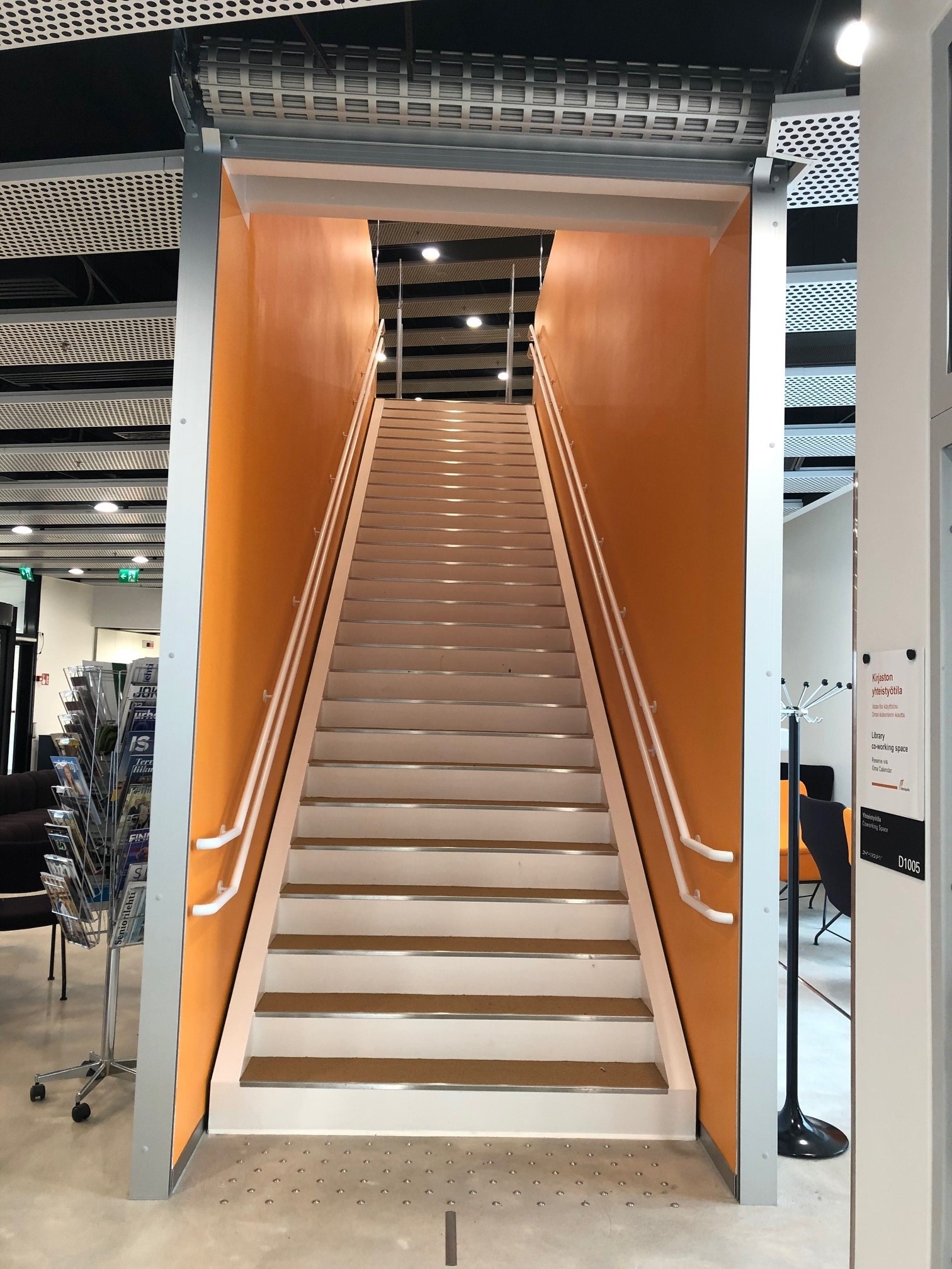 Kirjastoaulasta kirjaston toisen kerroksen tiloihin vievät portaat ovat käytössä kirjaston asiakaspalveluaikoina.