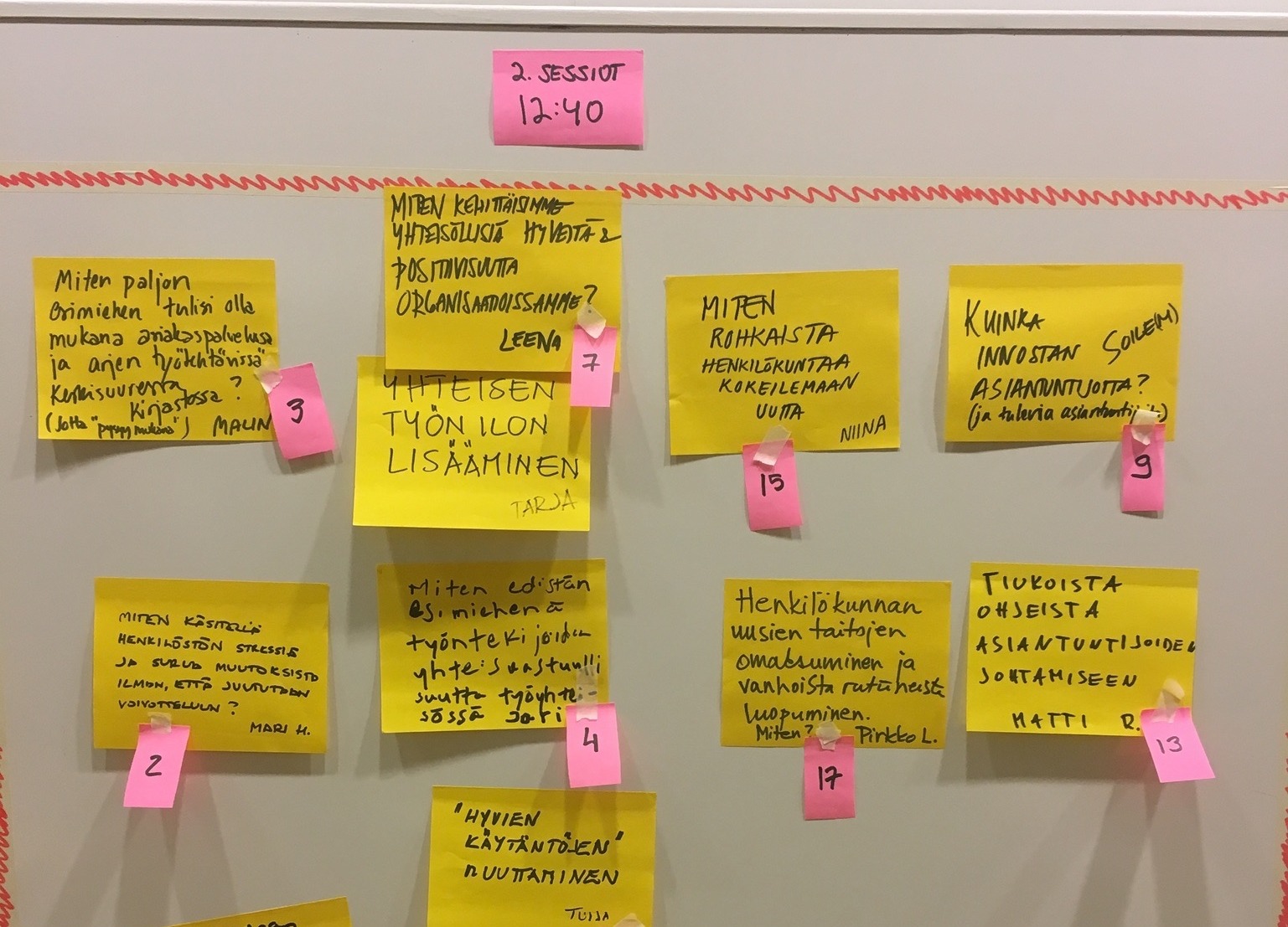 Pomo viestii - kuuleeko kukaan? Kuinka räjäyttää jähmeät tiimirakenteet? Mitkä kirjaston säännöt voidaan heittää roskikseen? Esimerkiksi tällaisia kysymyksiä nousi esiin, kun kirjastonjohtajat saivat KINE2016 -seminaarin päätteeksi vapaasti kertoa mistä asioista haluavat keskustella yhdessä. Open Space -työpaja aloitettiin luomalla agenda. Kaikilla oli mahdollisuus kirjoittaa ajankohtainen ja merkityksellinen asia tai kysymys Post it -lapulle. Tämän jälkeen jokainen ehdottaja kertoi nimensä ja kysymyksensä kaikille sekä vei lapun agenda-seinälle. Nopeasti koossa oli 50 ryhmäkeskustelua. Ensimmäiset sessiot alkoivat klo 11.45. Noin tunnin välein alkoi aina uusia keskusteluja. Kysymyksen ehdottaja toimi ryhmän vetäjänä ja osallistujat valitsivat vapaasti mihin keskusteluun haluavat osallistua. Ryhmäkeskusteluiden periaatteet olivat näkyvillä. Osallistujat noudattivat kahden jalan lakia. Jokainen sai siis valita vapaasti ryhmän ja siirtyä milloin halusi toiseen ryhmään tai pysyä loppuun asti samassa ryhmässä. Itseohjautuvasti kukin siis osallistui keskusteluun, jossa koki olevansa hyödyksi tai oppivansa jotain uutta. Eniten keskusteluja käytiin työhön liittyvistä muutoksista: turhat työt, uusien taitojen oppiminen, toimenkuvien muutokset, resurssien väheneminen, luovuus ja kokeileminen sekä muutosstressi. Toinen suosittu teema oli työntekijöiden innostaminen: Miten innostan ja innostun itse? Johtamisen eri näkökulmat olivat myöskin esillä: itsensä johtaminen, eri-ikäisten johtaminen sekä etäjohtaminen. Lisäksi keskusteltiin ilosta, kävelykokouksista, etiikasta, palkitsemisesta, asiakaspalveluvuorojen jakoperusteista ja päättäjistä. Open Space -iltapäivän lopuksi oli yhteenveto, jossa tilaisuuden vetäjät Anu ja Jussi Promindasta kysyivät mielipiteitä ja tunnelmia. Monet kiittelivät sitä, että kerrankin oli aikaa keskustella kollegoiden kanssa. Tilaisuuden jälkeen kootussa palautteessa tuli esiin myös kriittisiä kommentteja. Osan mielestä sessioita oli liian monta. Osa taas koki, että sessiot kestivät liian kauan. Joku koki hankalaksi uudenlaisen tavan toimia: keskusteluihin piti vaan mennä mukaan, ei tehty muistiota eikä kukaan johtanut tilannetta. Kirjastonjohtaja kuten moni muukin johtaja joutuu usein pohtimaan asioita yksin. Open Space -työpaja mahdollisti keskustelut, joihin ei arjen työkiireissä ole tilaa tai paikkaa: Pidin erityisesti perjantai-iltapäivän ohjelmasta, koska siinä pääsi paitsi miettimään oppimaansa, myös pohtimaan työhön liittyviä haasteita syvemmin yhdessä muiden samojen ongelmien kanssa kamppailevien kanssa. Tällaisissa tapahtumissa saatu vertaistuki on korvaamatonta pienen kirjaston yksinäiselle esimiehelle. Kaisu Kuvat: Prominda