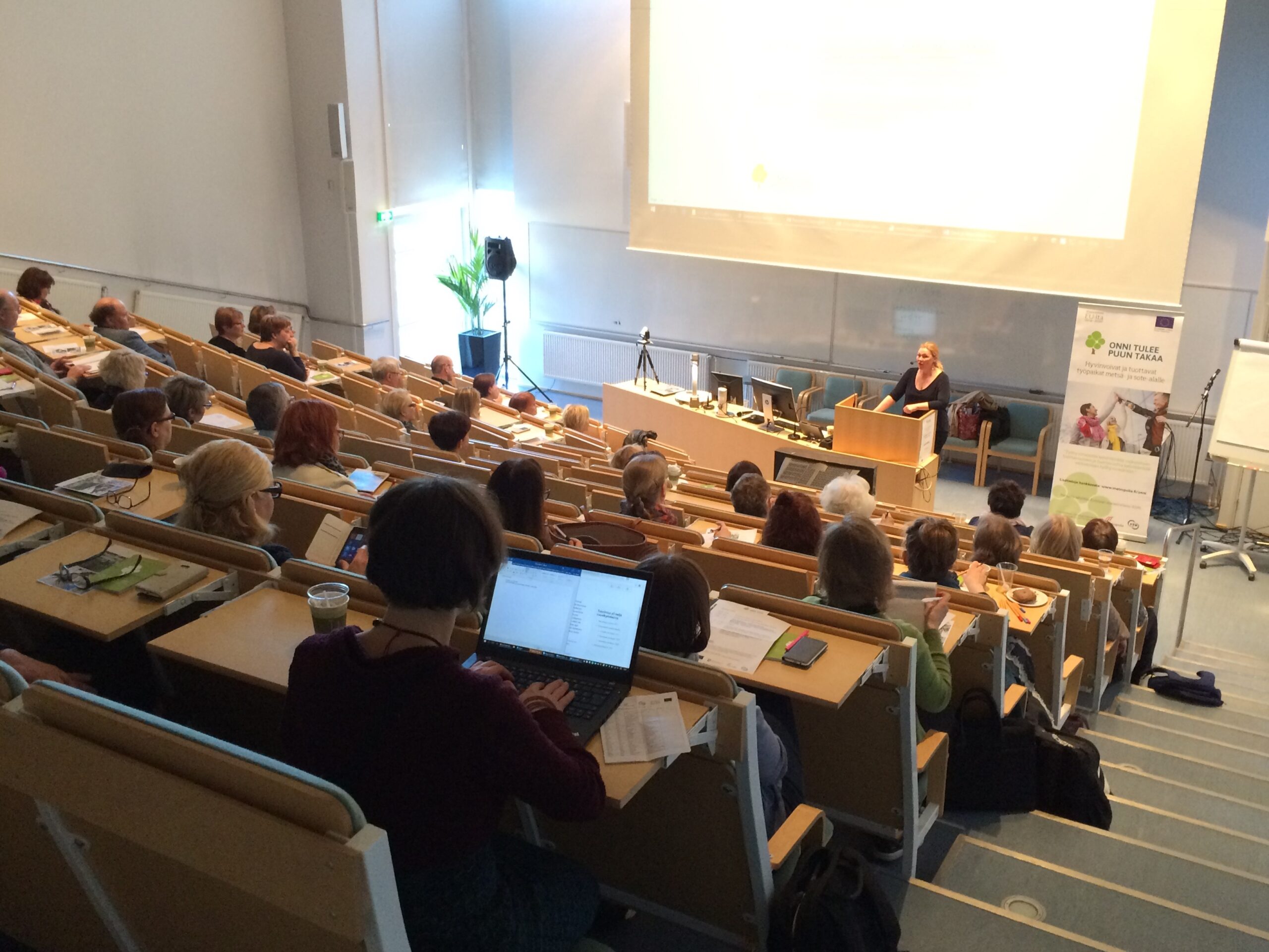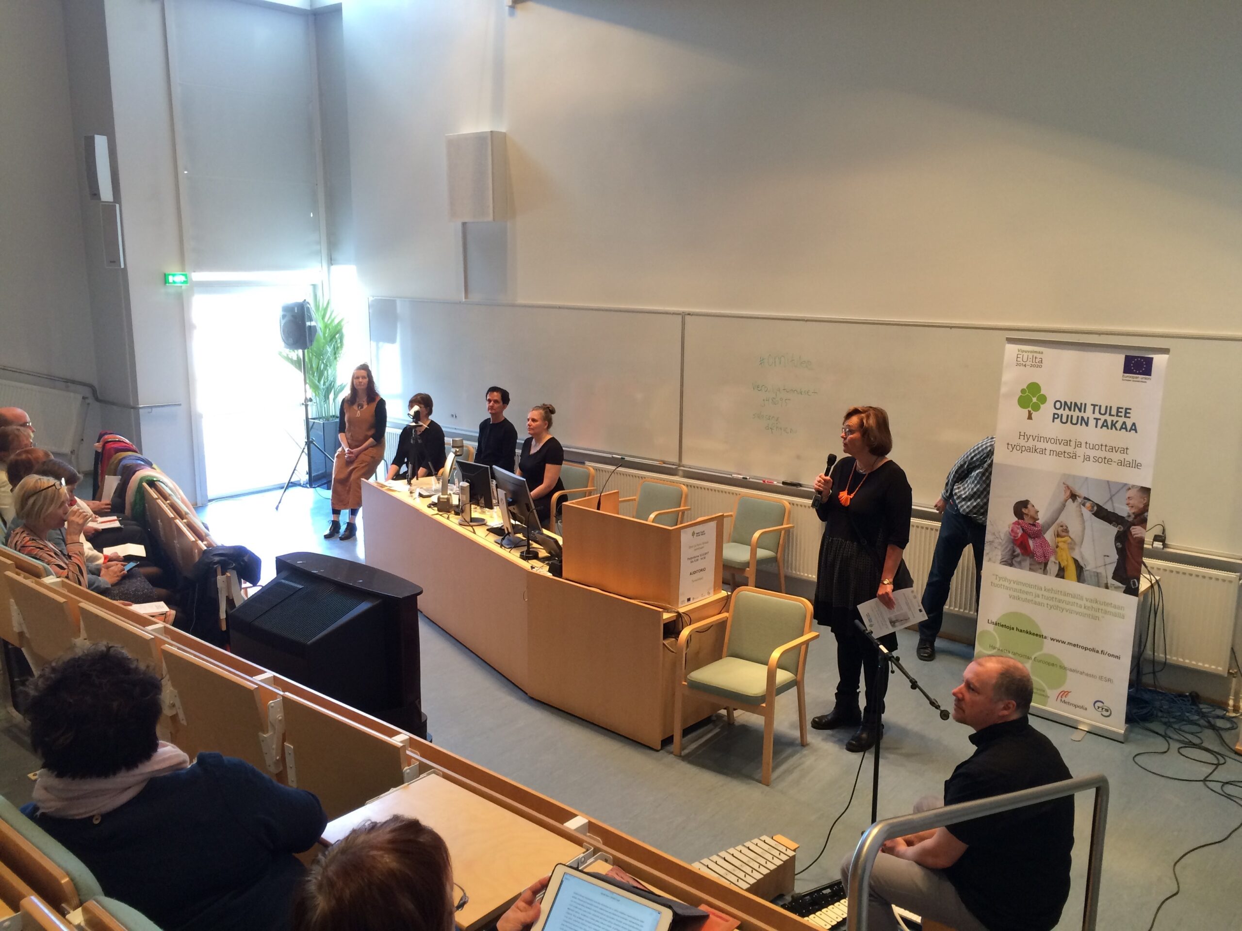 Mitä siitä syntyy, kun henkilöstö pääsee itse aidosti kehittämään yrityksen työhyvinvointia ja tuottavuutta? Puhuiko Onni kannonnokassa ja löysikö Ilona työniloa? Näihin kysymyksiin etsittiin vastauksia Onni tulee puun takaa – hyvinvoivat ja tuottavat työpaikat metsä- ja sote-alalle (ESR) -hankkeen loppuseminaarissa 12.5.2017 Metropolia Ammattikorkeakoulun Vanhan Viertotien toimipisteessä.