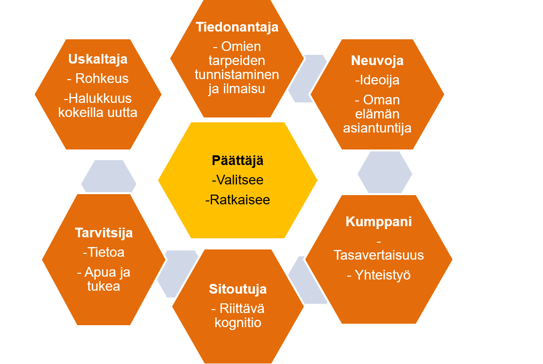 • Asiakas on päättäjä. Asiakkaan rooleista keskeisin tulisi olla päättäjän rooli, jolloin hän tarvitsemansa tiedon ja tuen avulla tekee itsenäisiä valintoja ja ratkaisuja, joilla on vaikutusta hänen hyvinvointiinsa ja elämänsä suunnitteluun. Päättäjän roolin kehittyminen vaatii työntekijältä ymmärrystä omasta roolistaan, joista keskeisin on yhteistyön vahvistajan rooli. Vahvistajan rooliin liittyy luottamuksen rakentaminen ja vuorovaikutuksen laatu; kompetenssit asiakkaan kohtaamiseen ja kuuntelemiseen. Tuen tarpeen taso voi vaihdella elämäntilanteiden ja voimavarojen muuttuessa (Klockmo, Marnetoft, Nordenmark, 2012: 12-14.) Roolin toteutuminen mahdollistuu, kun työntekijä osaa joustavasti hyödyntää kaikkia roolikartan rooleja.
