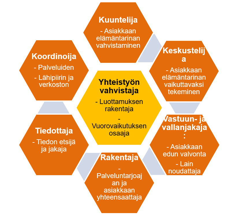 • Työntekijä on yhteistyön vahvistaja.Asiakastyöntekijää tai lähityöntekijää tarvitaan vahvistamaan niiden ihmisten ääntä, joilla on haasteita elää oman näköistä elämää ja tehdä kansalaisena valintoja ja ratkaisuja. Osallistuminen oman elämän suunnitteluun täysivaltaisesti omien voimavarojen sekä lähituen avulla, lisää aktiivisuutta osallistua ja vaikuttaa myös yhteisöissä laajemminkin.