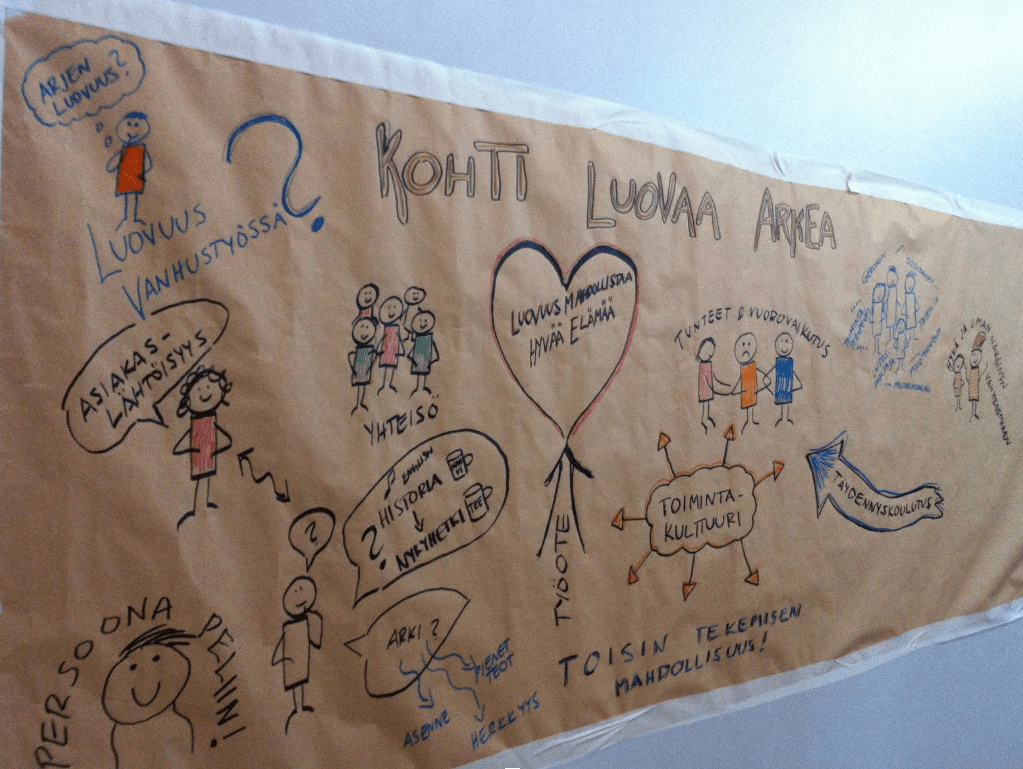 Kokemukset itsestä luovana olentona voivat rikastaa elämää ja mielikuvitus laajentaa sen ulottuvuuksia arjen rajoitteiden ohi. Mitä enemmän elämämme kaventuu esimerkiksi iän tai sairauden myötä, sitä enemmän olisi tarpeen laajentaa kokemusmaailmaamme taiteen ja leikin avulla. Arkea rikastava luovuus voi olla pieniä tekoja tai arjen suunnittelua uudella tavalla. Millaista merkitystä luovuudella, osallistavalla taidetoiminnalla sekä kulttuuria arvostavalla näkökulmalla on esimerkiksi iäkkäälle ihmiselle sekä vanhuspalveluyksikön koko yhteisölle? Ihminen luovana olentona ei lakkaa olemasta sairastuessaan, vanhetessaan ja henkisten sekä fyysisten mahdollisuuksien kaventuessa. Ihminen on myös yhteisöllinen olento. Elämämme merkitykset rakentuvat suhteissa toisiin ja vuorovaikutuksessa. Luovalla toiminnalla voidaan rakentaa yhteisöllisyyttä jopa silloin, kun kieleen perustuva vuorovaikutus ei ole enää käytössä. Yhdessä laulaminen luo yhteisen tilan, jossa koetaan ja jaetaan merkityksellisiä kokemuksia. Myös musiikin kuuntelutilanne on kokemuksena erilainen, jos olemme siinä yhdessä, hengitämme, aistimme toisemme ja musiikin herättämät tunteet. Yhdessä liikkuminen aktivoi meissä vastavuoroisuuden kokemuksia ja yhteisen tanssihetken iäkkään ihmisen kanssa voi rakentaa vaikka sängyn vierellä kädestä kiinni pitäen. Luova vuorovaikutus kuuluu vanhustyön ytimeen Kohti luovaa arkea- kulttuurinen vanhustyö asiakaslähtöisyyden edistäjänä - tutkimushanke selvitti, mikä vaikuttaa työntekijöiden mahdollisuuksiin hyödyntää työssään luovuutta, taidetoimintaa ja kulttuurisen vanhustyön näkökulmaa. Metropolia Ammattikorkeakoulun toteuttaman tutkimuksen aineisto koostui 14 vanhustyössä erilaisissa tehtävissä toimivan työntekijän haastatteluista. (Huhtinen-Hildén, Puustelli-Pitkänen, Strandman & Ala-Nikkola 2017.) Tutkimuksessa haastateltujen vanhustyössä toimivien ammattilaisten kokemukset kertovat, kuinka monella tavalla luovuus voi olla läsnä iäkkään ihmisen ja yhteisön elämää. Tärkeää vanhustyön kehittämisessä tähän suuntaan on jokaisen työntekijän oman luovuuden löytäminen ja ammattikuvan kehittäminen niin, että herkkyys, luovuus ja vuorovaikutus kuuluvat ammattitaidon ytimeen. (emt.) Mielenkiintoista tässä tutkimuksessa oli erityisesti se, kuinka keskeisessä roolissa työntekijöiden luvan saamisen kokemus oli sille, miten he kokivat voivansa käyttää luovuutta työssään. Lupa ei useinkaan ollut mitenkään konkreettinen, esimerkiksi esimiehen taholta annettu valtuutus. Luovaan työotteeseen vaikuttavat monet tekijät: esimiehen, kollegan ja asiakkaan toiminta ja asenteet sekä työntekijän oma ammatillinen toimijuus ja osaaminen. (emt., 94-99.) Kohtaaminen vaatii ammattilaiselta osaamista Mitä voisimme oppia tästä tutkimuksesta, millaista elämää ja toimintakulttuuria työpaikoilla haluaisimme olla kehittämässä? Niin kasvatus- kuin hoitoaloilla ovat nousseet kriittiseen tarkasteluun käsitykset asiantuntijuudesta sekä oppija- tai asiakaslähtöisyydestä. Kohti luovaa arkea- tutkimus haastaa pohtimaan vanhustyön ammattitaitoa ja vuorovaikutuksen asiantuntijan roolia siinä. Kokonaisvaltainen asiakkaan kohtaaminen vaatii toteutuakseen kokonaisvaltaista ammattilaista. Moni tutkimuksessa haastateltu pohti sitä, kuinka oma persoona voi olla osana ammatillista toimintaa. Eräs haastateltava kuvasi pohdintaansa näin: ”(M)un juttu on just se et mä oon omana ittenäni, tottakai ammatillisesti ja asiallisesti. Mut ku ei ne ihmiset kaipaa aina sitä että niiden ympärillä pyörii koko ajan hoitaja, vaan ne kaipaa että siinä on ihminen. Ja se vaatii rohkeutta siltä hoitajalta olla se ihminen.” (emt., 92). Herkkyys ja kohtaaminen liittyivät haastateltavien kokemuksissa luovuuteen. Työntekijän mielikuvitus ja luova asenne voivat toimia työvälineinä, joiden kautta vuorovaikutuksessa otamme vastaan viestejä ja herkistymme asiakkaan tarpeille. Iäkkään ihmisen kohtaamisen hänen kokemusmaailmassaan vaatii kykyä eläytyä ja arjessa erilaisten ihmisten tarpeisiin vastaaminen luovaa ongelmanratkaisukykyä. (emt.) Luova asenne voi helpottaa esimerkiksi tavallisia arjen toimia, kuten pukeutumista tai syömistilannetta: ”(K)äytännön tilanteet -- niissä se luovien ratkasujen löytäminen. Et sehän on niinku online -- jos joku ei onnistu ni siinä täytyy heti sit miettiä mikä vois onnistuu -- miten päästäis niinku aamupalapöytään tai miten onnistus joku pukeutuminen -- tässä sitä se luovuus et koko ajan miettii niitä ratkasuja siihen --.” (emt., 55). Kulttuurisen vanhustyön kehittämisessä tärkeää on se, että jokaisessa oleva luovuus tulee huomatuksi: "S)en luovuuden ei tarvi olla mitään suurta, järjestettyä, joka vaatii erityisosaamista, joka tarvii terapiahenkilökunnan paikalle, vaan et se voi olla ihan jotain pientä. Ja se että se voi olla niinku sun työmenetelmä, niinku keino, joka päivä.” (emt., 74) Tarvitaan monialaista innostusta sekä yhteistyötä rakentamaan sellaisia käytäntöjä, asenteita ja toimintakulttuuria, jotka mahdollistavat luovaa arkea vanhustyössä. Sen avulla arki voi olla värikkäämpi ja soida kauniimmin - luovuus lisää hyvinvointia koko yhteisöissä. Kirjoittaja Laura Huhtinen-Hildén (FT, MuM, musiikkiterapeutti, työnohjaaja) toimii pääainevastaavana, tutkijana, musiikkikasvatuksen lehtorina ja yhteisömuusikkokoulutuksen vastuulehtorina Metropolia Ammattikorkeakoulussa. Hän on kiinnostunut taiteen soveltavasta käytöstä ja luovan ryhmätoiminnan mahdollisuuksista sosiaali- ja terveysalojen konteksteissa ja on johtanut useita näihin teemoihin liittyviä kehittämishankkeita (esim. Kulttuurisilta EAKR-hanke 2008–2011). Hän on toiminut vastaavana tutkijana Kohti luovaa arkea - kulttuurinen vanhustyö asiakaslähtöisessä toimintakulttuurissa 2015-2017 sekä valtakunnalliseen sosiaalisen kuntoutuksen