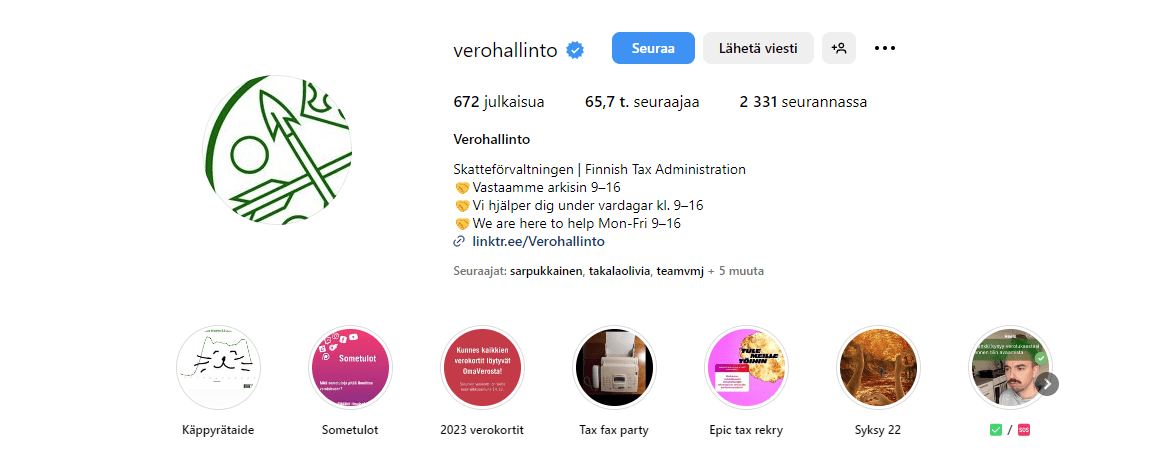 Olen itse tästä täysin samaa mieltä, sillä toistuvat, painostavat mainokset esimerkiksi Instagramissa tuntuvat herkästi ärsyttävältä kiinnostavan sijasta. Tämän vuoksi haluan itse miettiä alusta lähtien lähestymistapaa, jossa postaukset eivät vaikuta suoralta mainonnalta, vaan enemmän kurkistuksilta yrityksen arkeen, antaen helposti lähestyttävän ja inhimillisen kuvan.Mielestäni tämä malli sopii erityisesti silloin, kun halutaan pehmentää yrityksen kuvaa ja päästä pois kylmästä, liian ammattimaisesta mielikuvasta. Hyvä esimerkki tästä on Verohallinnon Instagram-tili, jossa sisältö tekee esimerkiksi veroihin ja veroprosenttiin liittyvät asiat helpommin saavutettaviksi ja ymmärrettäviksi nuoremmille henkilöille humoristisella ja rennolla otteella.