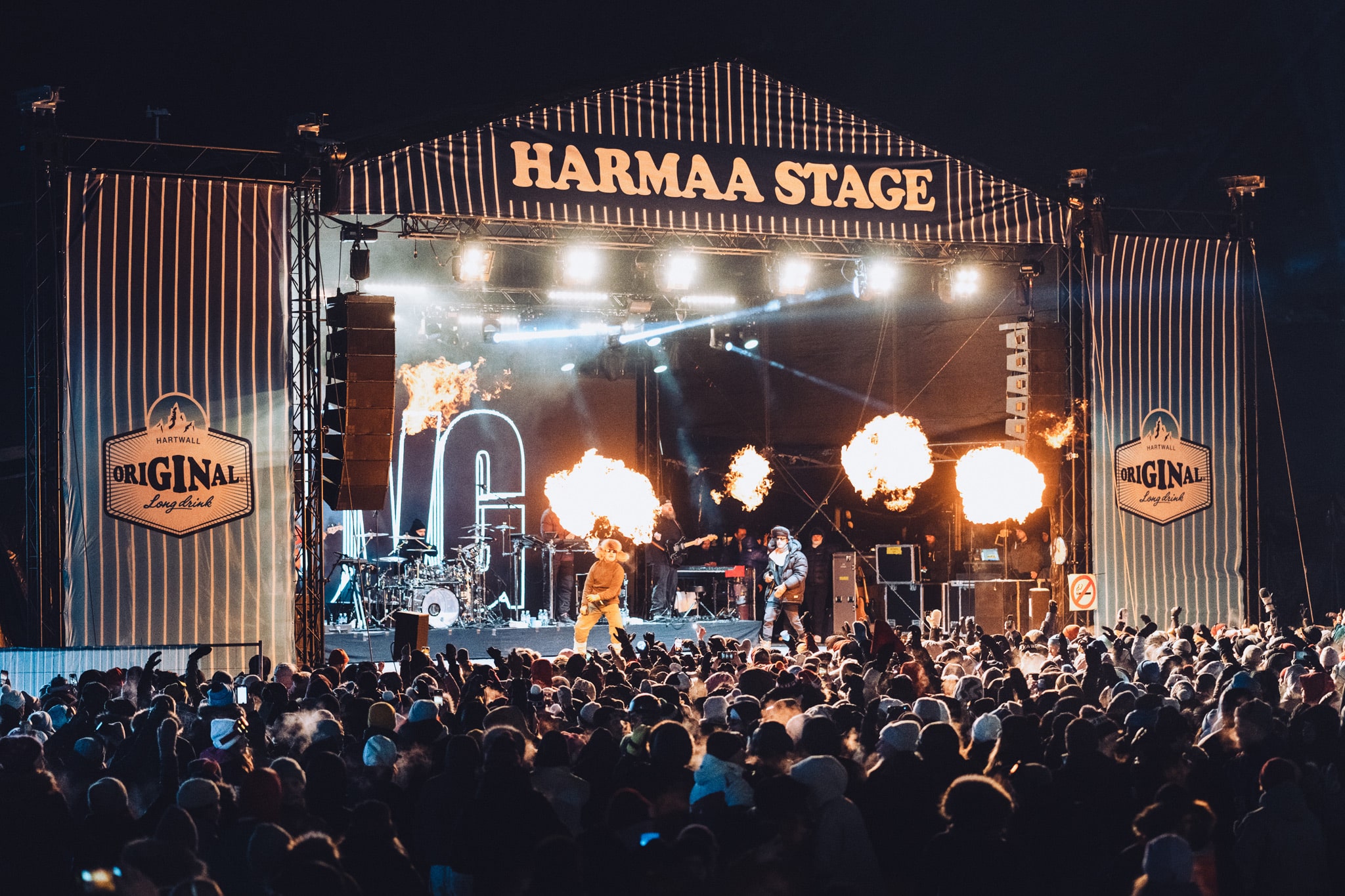 Talviolosuhteisiin sijoittuvat tapahtumat eivät ole enää viime vuosina rajoittuneet ainoastaan hiihtokilpailuihin tai joulumarkkinoihin, vaan lumikinosten ja pakkasten keskellä ovat alkaneet yleistyä myös monenlaiset muut tapahtumat – myös festivaalit. Toistaiseksi kuitenkin suuri osa vannoutuneimmistakin festarikävijöistä odottaa yhä mahdollisuuttaan kokea talvimaiseman, livemusiikin ja perinteisesti kesään yhdistetyn festarihuuman kummallisen, mutta koukuttavan kombinaation. Uskallan väittää, että sitäkin harvempi tapahtuma-alalla työskentelevä on päässyt mukaan toteuttamaan monipäiväistä festaria keskellä talvea. Olinkin äärimmäisen innoissani ja otettu, kun minulle itselleni tällaista mahdollisuutta tarjottiin hieman alle vuosi sitten. Harmaa Rinne 2024 ja festarityö talviolosuhteissa Harmaa Rinne -festivaali järjestettiin ensimmäistä kertaa Rukan hiihtostadionilla 22.-23.3.2024, ja minulla oli suuri ilo työskennellä osana tapahtuman huikeaa, ammattitaitoista tuotantotiimiä. Harmaa Rinne on Suomen suurin after ski -tapahtuma, joka tuo ainutlaatuisella tavalla yhteen live-musiikin, festaritunnelman sekä laskettelun Rukan aurinkoisilla keväthangilla. Festivaalin pääyhteistyökumppani on Hartwall Original Long Drink – tuttavallisemmin lonkero, jonka harmaa sävy on ollut myös inspiraationa tapahtuman nimelle. Vaikka olin alusta lähtien projektista hyvin innoissani, olin myös hieman varuillani sen suhteen, millaista festivaalin tekeminen talvella tulee todellisuudessa olemaan. Festivaalin rakennustöiden vähitellen lähestyessä huomasin, että erilaiset epämiellyttävät skenaariot paukkupakkasessa tai räntäsateessa värjöttelystä, peilijäällä liukastelusta tai festariaitojen kanssa lumihangessa rämpimisestä alkoivat salakavalasti hiipiä mieleeni. En toki antanut moisten vähäpätöisten ajatusten lannistaa itseäni niin, että olisin missään vaiheessa edes harkinnut luovuttamista projektin suhteen – päinvastoin! Pienestä skeptisyydestäni huolimatta olin alusta alkaen valmis ottamaan talven tarjoamat olosuhteet vastaan arvokkaana ja tervetulleena haasteena. Kun viimein saavuimme Rukan hiihtostadionille käynnistämään festivaalin rakennusurakkaa, kävi yllättävänkin pian ilmi, että epäluuloni ja huoleni olivat olleet täysin turhia. Olin jopa yllättynyt siitä, miten jo ensimmäisten festivaalialueella vietettyjen tuntien jälkeen en enää edes kiinnittänyt huomiota siihen, että oli talvi. Valehtelisin jos väittäisin, ettei työskentely eronnut jossain määrin totutusta, mutta suurin yksittäinen ero verrattuna kesäfestareilla työskentelyyn oli se, että lunta oli huomattavasti enemmän – eikä sekään ollut lopulta ongelma. Toki säästyimme Rukalla työskennellessämme myös pahimmilta sääolosuhteilta. Kokemus ei todennäköisesti olisi ollut aivan yhtä mukava ja nautinnollinen, jos esimerkiksi vesi- tai räntäsateet olisivat haitanneet työskentelyä festarialueella. Lämpötila alhaalla - tunnelma korkealla! Festarialueen valmistuttua ja porttien auettua myös kävijöiden kasvoilta oli aistittavissa, ettei festivaalimeininki ja live-musiikin riemu vaadi toteutuakseen helteisiä kesäpäiviä, vaan saman fiiliksen saavuttaminen on aivan yhtä mahdollista myös talven keskellä. Vaikka elohopea sukelsikin selvästi pakkasen puolelle festivaaliviikonlopun aikana, oli after ski -kansasta välittyvä tunnelma yhtä lämmin, kuin vaikkapa heinäkuisen Ruisrockin rantalavalla. Harmaa Rinne 2024 -festivaali oli erittäin onnistunut ja menestyksekäs uuden tapahtumakonseptin debyytti! Festivaalituotannolle tapahtuman jälkeen satanut palaute oli niin yleisön, yhteistyökumppaneiden kuin artistienkin puolelta erittäin positiivista. Ensimmäisen Harmaa Rinne -festivaalin menestystä kuvaa parhaiten kuitenkin se, että festivaalin jatkosta tiedotettiin jo ennen kesän alkua. Harmaa Rinne 2025 järjestetään jälleen Rukan hiihtostadionilla 28.-29.3.2025! Omalta osaltani Harmaa Rinne -projekti oli kaiken kaikkiaan todella hieno ja opettavainen kokemus. Erityisen mahtavaa oli päästä mukaan toteuttamaan monipäiväistä festivaalia talvisissa olosuhteissa, mikä ei lopulta ollut läheskään niin haastavaa tai raskasta, kuin olin etukäteen kuvitellut. Mielestäni ihailtavaa ennakkoluulottomuutta ja uudenlaista näkökulmaa osoittaa se, että yhä useammat tapahtumatuottajat ovat alkaneet järjestää festareita ympäri vuoden – näitä lisää! E-P Heinämäki, kulttuurituotanto 2016