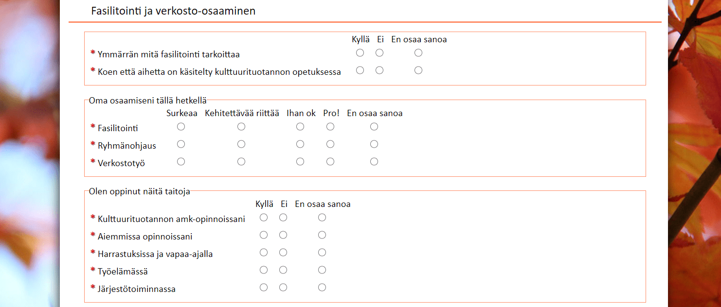Viime keväänä minulle tarjoutui mahdollisuus osallistua Euroopan sosiaalirahaston rahoittamaan hankkeeseen. Tehtävänä oli tehdä kyselytutkimus kulttuurituottajaopiskelijoille. Kyseessä oli jo moneen kertaan opiskelujen aikana vilahtanut Höntsä – Silta eteenpäin! -hanke, joka tukee nuorten osallisuutta tarjoamalla yhdenvertaisempia harrastusmahdollisuuksia. Kyselytutkimuksella haluttiin selvittää, onko kulttuurituottajaopiskelijoilla kiinnostusta ja taitoja työskennellä tulevaisuudessa harrastetoiminnan ohjaajina oppilaitosympäristössä. Tarjolla voisi olla uudenlainen julkisen sektorin tarjoama työnkuva. Tein projektia keväästä loppusyksyyn. Alussa olin yhteydessä oppilaitoksiin hakemalla tutkimusluvat. Siinä sivussa rakentelin jo runkoa kysymyksille. Ohjaajani kanssa pidimme välipalavereita, joissa tsekattiin, että pysytään asian ytimessä ja mitkä ovat projektin seuraavat etapit. Koko aihepiiri oli vielä itselleni tuntematon, eli opettelin sitä samaan aikaan kun tein kyselyä. Se antoi sopivasti haastetta. Vaikka kaikki opiskelu oli jo siirtynyt verkkoon ennen kuin ryhdyin tekemään projektia ja olin tottunut etätyöskentelyyn, itsensä johtaminen korostui kuitenkin enemmän tässä projektissa. Määrittelin itselleni välietappeja niin, että loogisesti eteneminen olisi helpompaa ja näkisin konkreettisesti missä mennään. Projektin eteneminen oli vain itsestäni kiinni, joten koitin keksiä tapoja helpottaa etätyöskentelyä ja tehdä siitä mieluisaa. Parhaiten minulle toimi etukäteen aikataulutetut kahvilahetket, jolloin keskityin pelkkään projektin tekoon. Kaikista kiinnostavinta projektissa oli olla osa ESR-rahoitteista hanketta, soveltaa omaa osaamista, hypätä tuntemattomaan projektiin, ottaa sen kokonaisuus haltuun ja sen pohjalta luoda kysely omille opiskelijatovereille – ja huomata onnistuneensa! Vinkkejä itsenäisten projektin tekijöille: Tartu rohkeasti uusiin projekteihin, vaikka se ei olisikaan sinun ykköskiinnostuksen kohteesi. Opit paljon uutta! Pidä oppimispäiväkirjaa. Se auttaa raportointia myöhemmin. Taulukoi työtunnit, niin pysyt kärryillä omasta ajankäytöstäsi. Aikatauluta myös vapaapäiviä! Varaa tarpeeksi aikaa taustatyölle. Luetuta teksti tarpeen tullen ulkopuolisella. Omalle tekstille saattaa sokeutua, joten ylimääräisitä silmäpareista on hyötyä. Terkuin, Emmi / kutu18