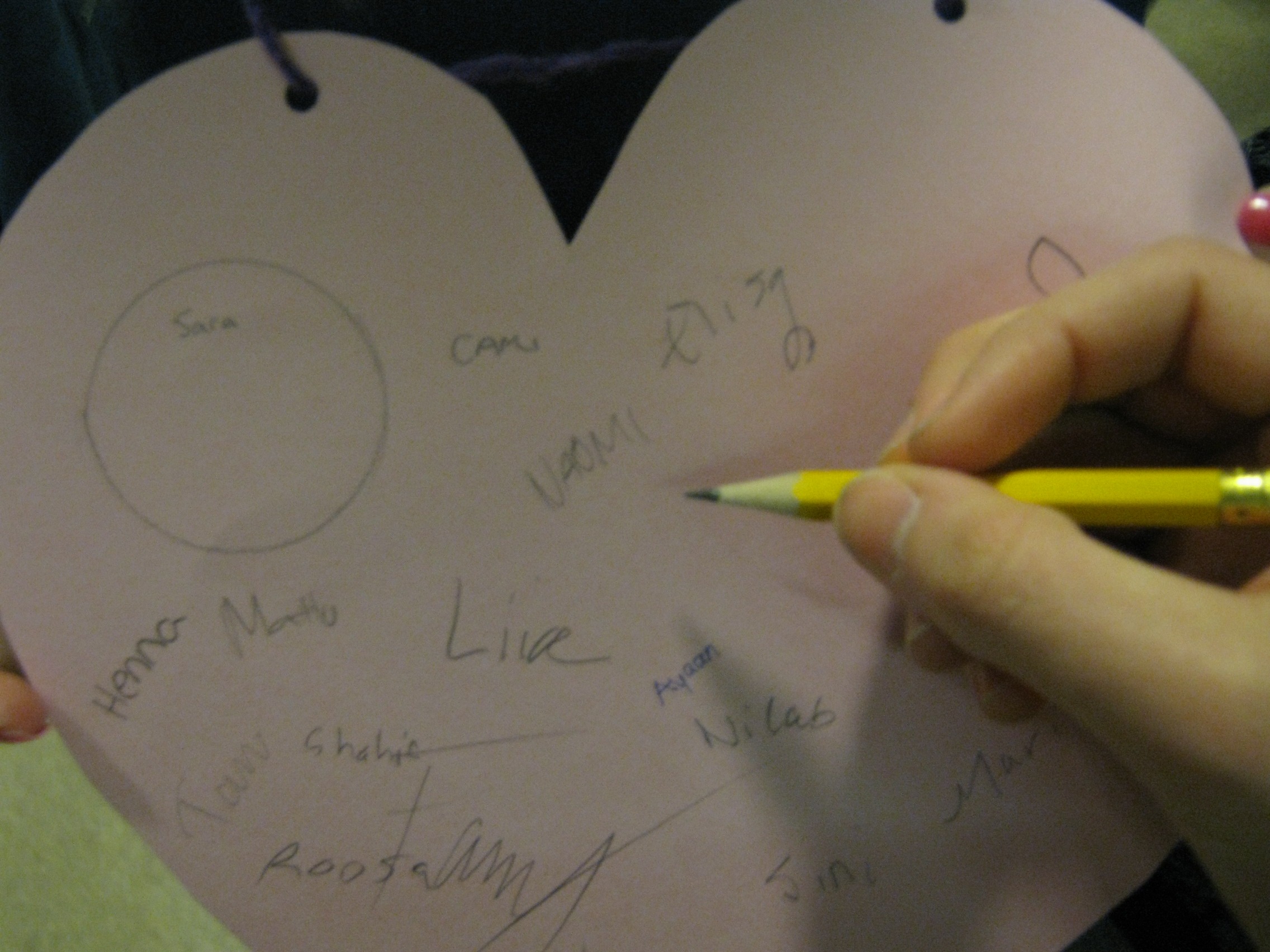 Tukioppilaat jakoivat ystävänpäivänä välitunneilla itse askartelemiaan pahvisia sydämiä kaikille halukkaille. Ideana oli kerätä nimiä omaan sydämeensä. Nimen sai aina, kun halasi jotakuta.